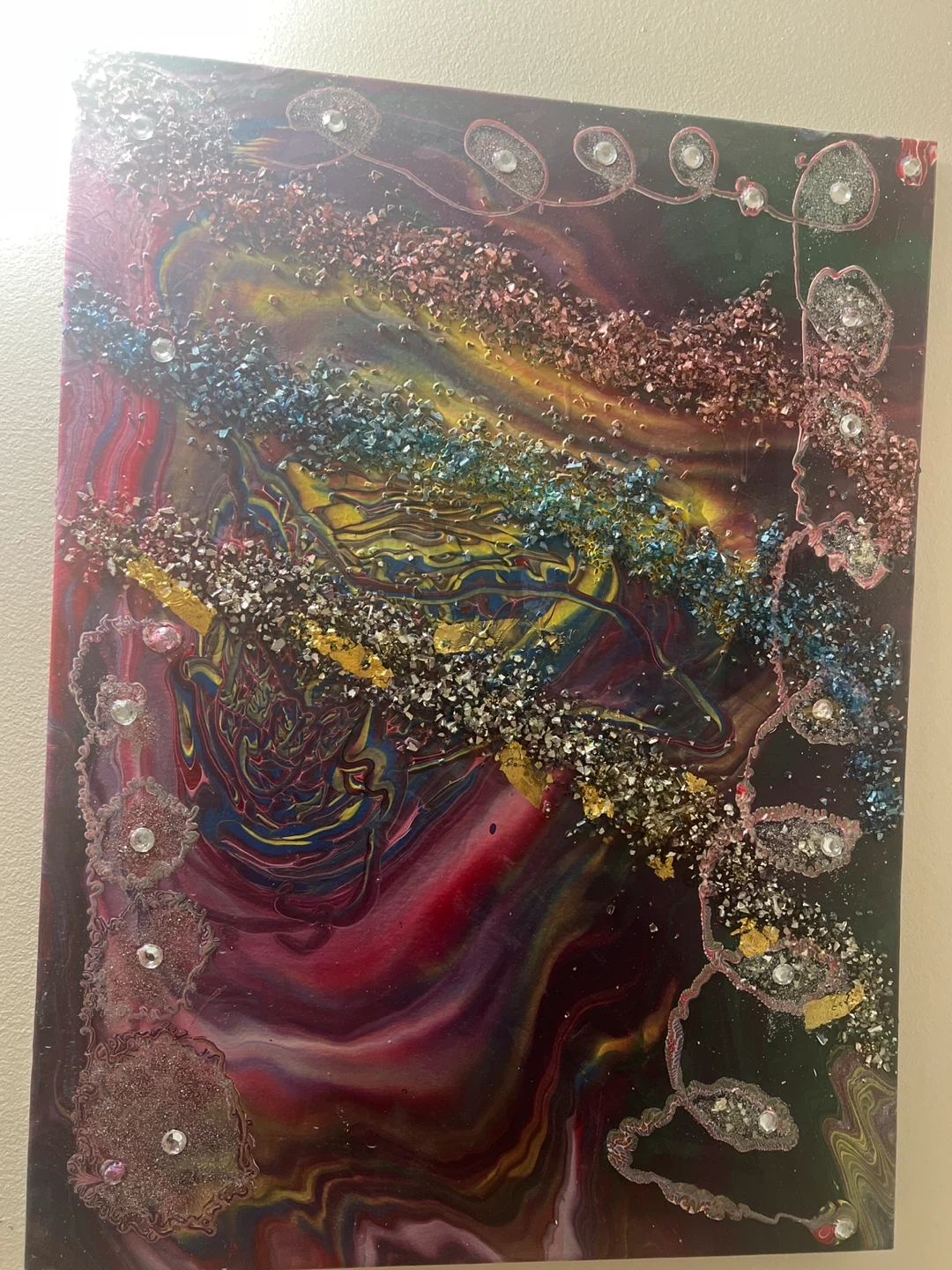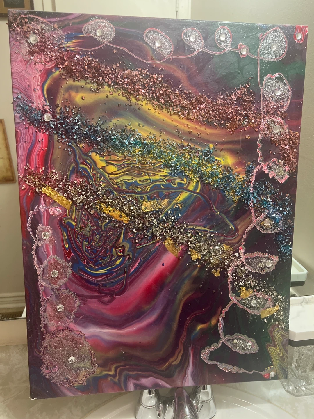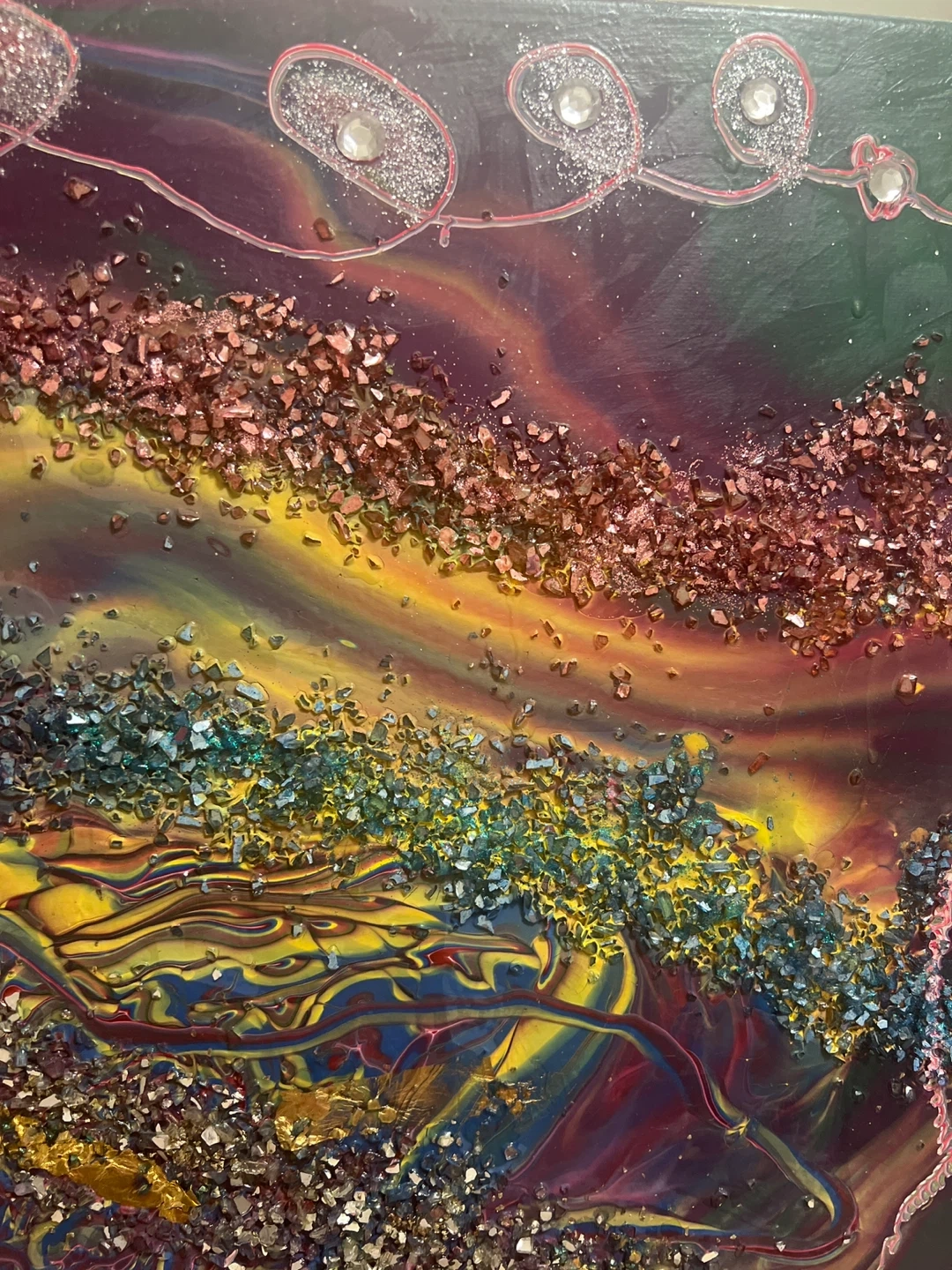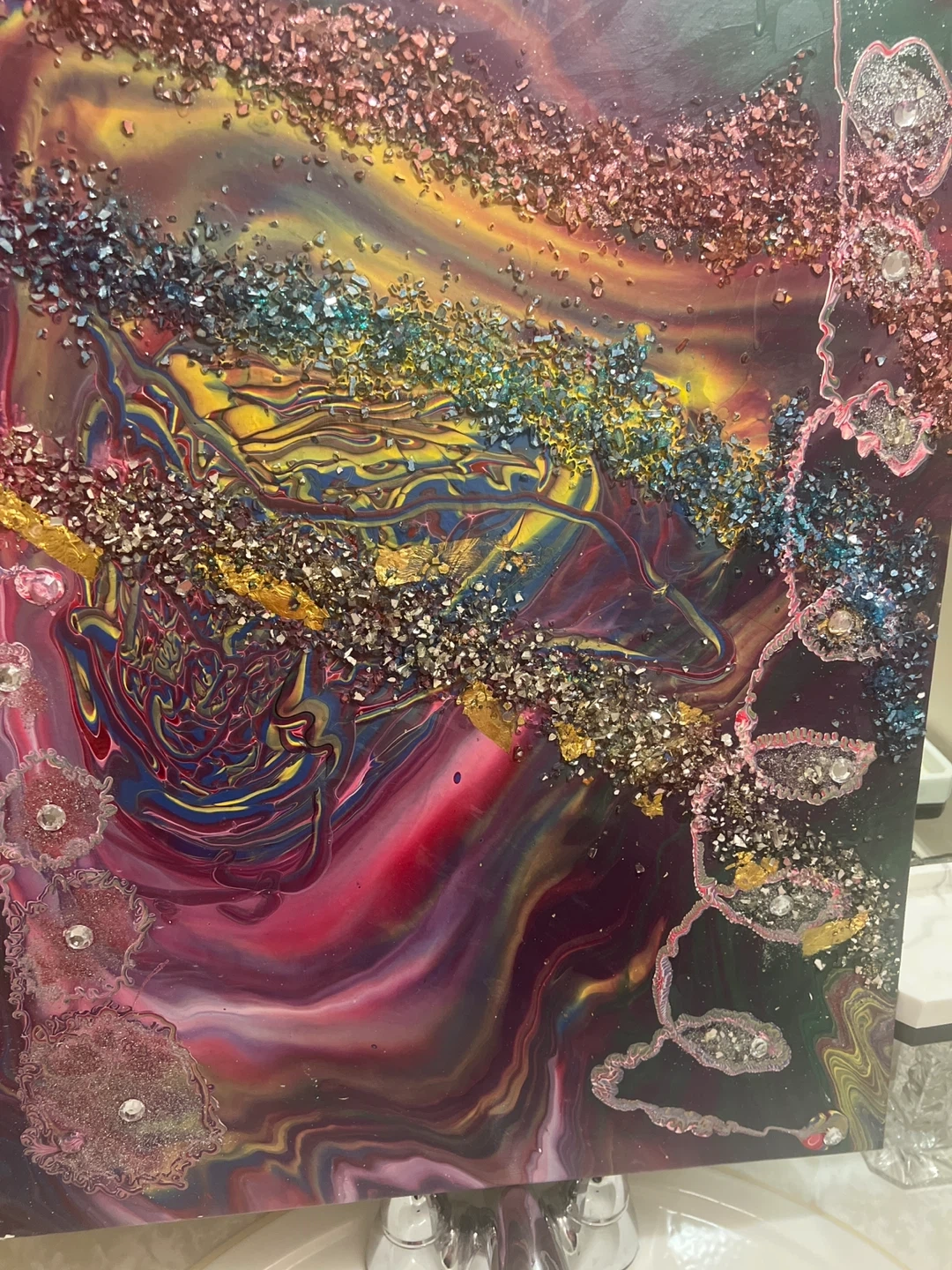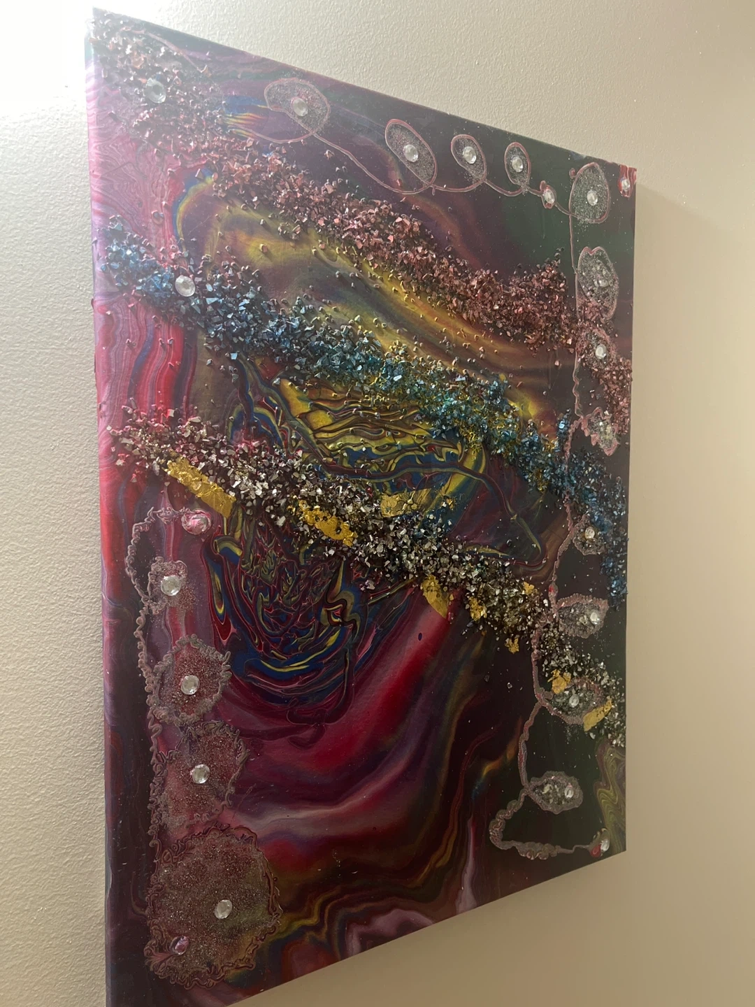 Unique abstract canvas art with glitter and jewel accents. The colours are vibrant and eye-catching, perfect for adding a bit of sparkle to any room!