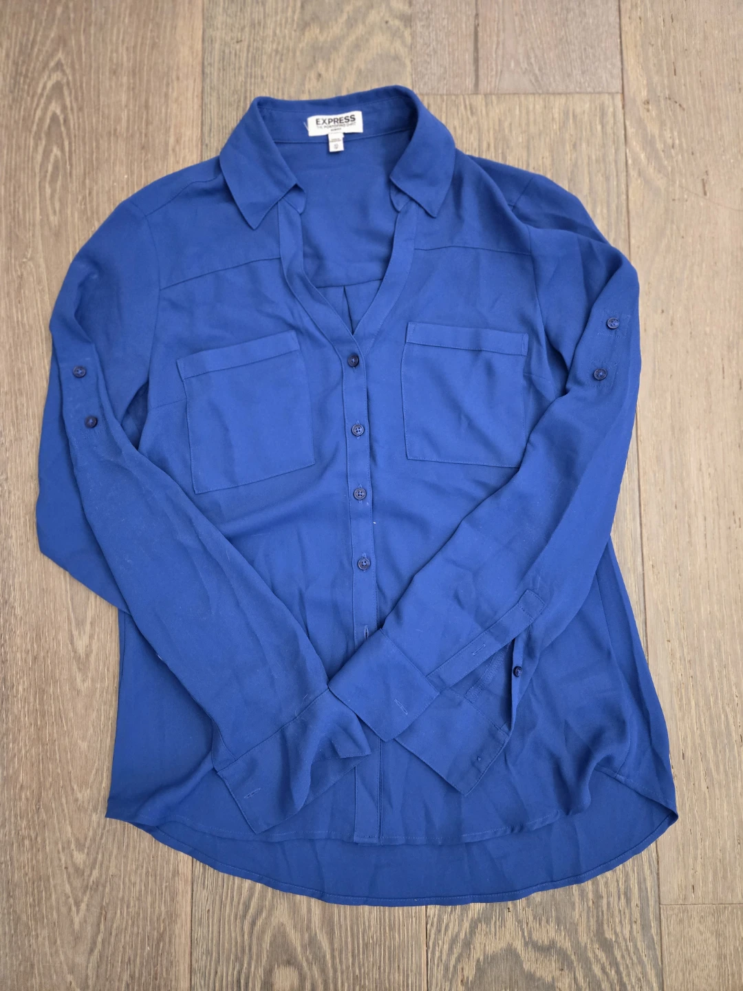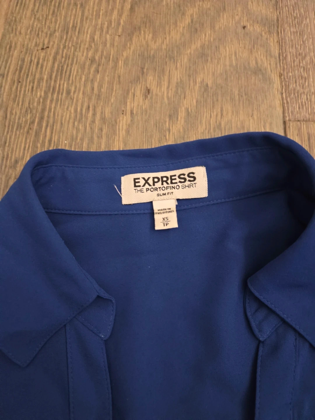 Here's a stylish Express Portofino shirt in a vibrant blue! It's a slim fit, size XS. This shirt features a classic button-down design with a flattering silhouette. Perfect for dressing up or down!