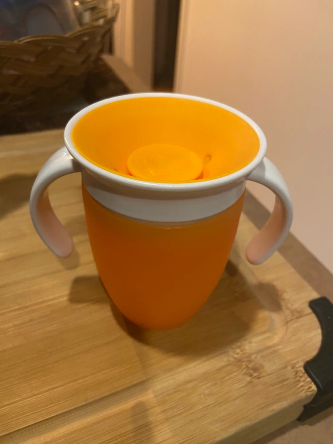 A Munchkin Miracle 360 Sippy Cup in orange! This cup is designed to prevent spills and is easy for toddlers to drink from. It's gently used but in great condition and ready for a new little one to enjoy. Barley used.
