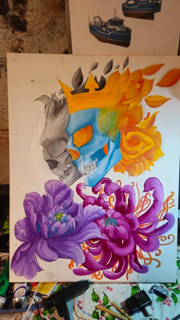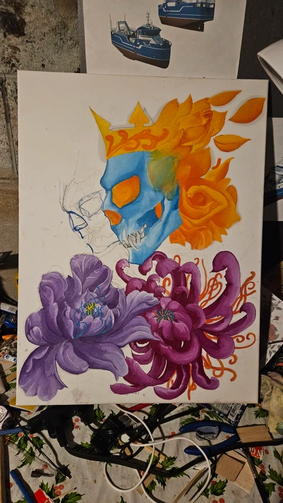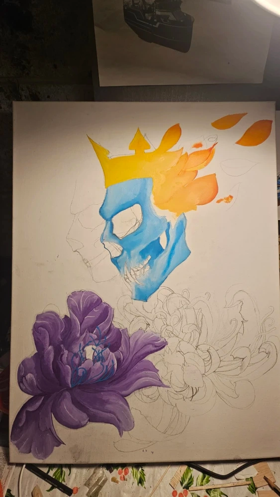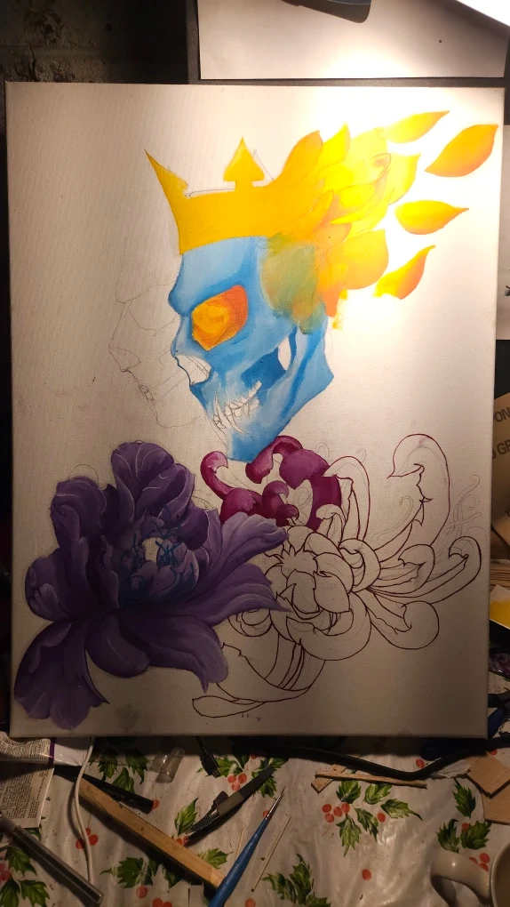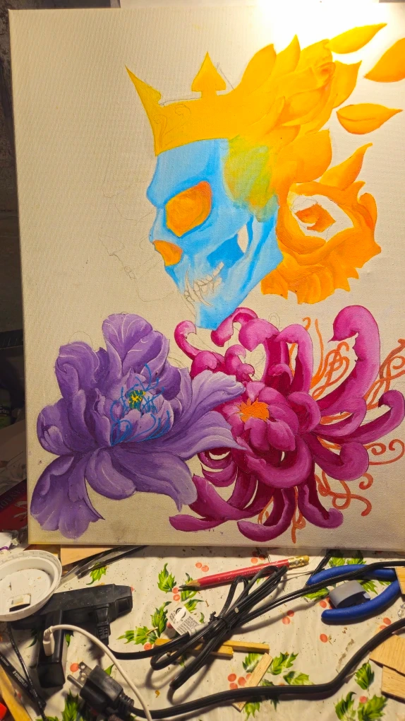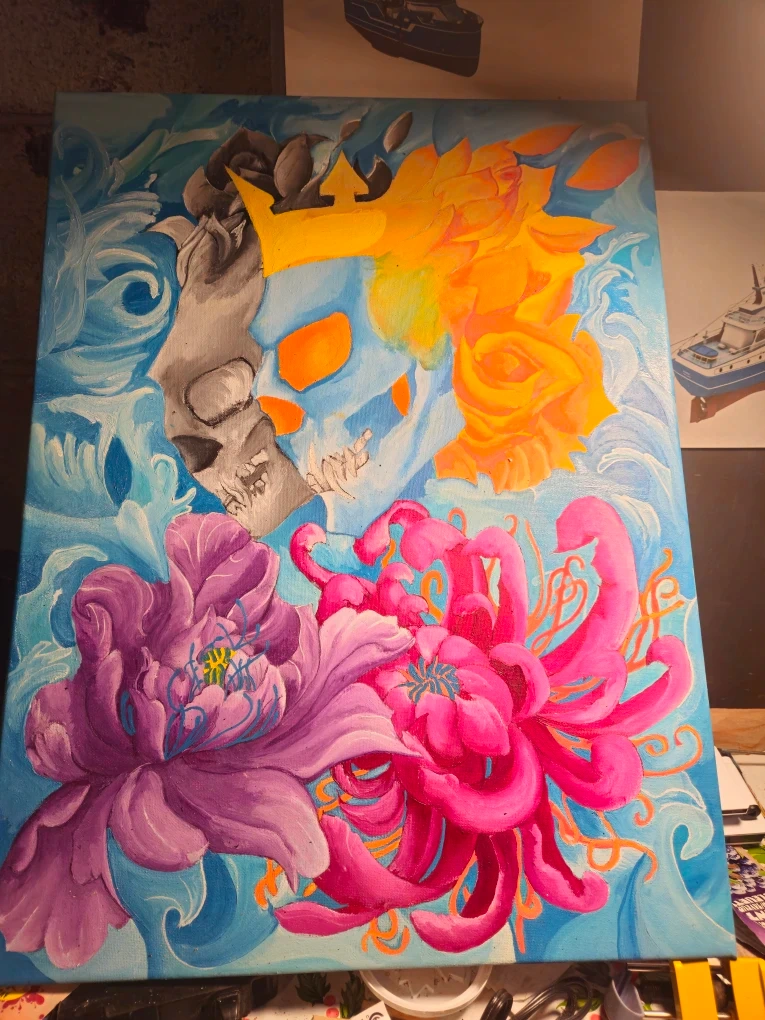 Original painting of 2 skulls with a crown and flowers. It's on canvas and ready to hang!