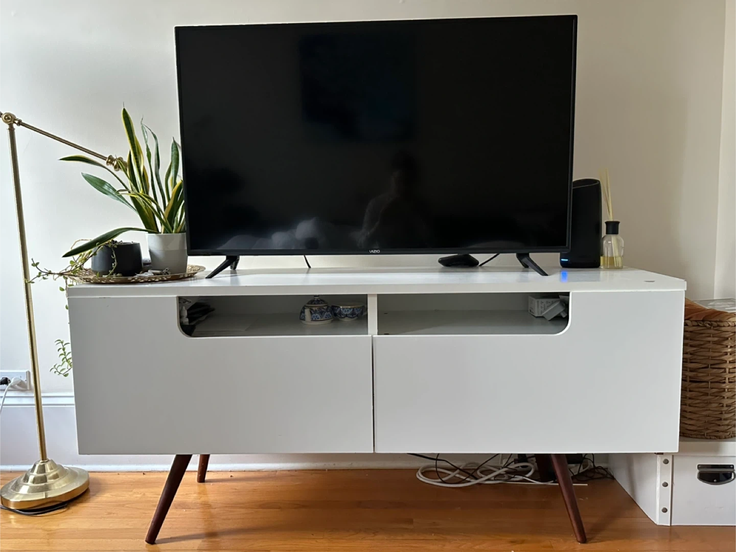 1- WestElm TV Stand (white): L 62”, W 18”, H 28” 120$