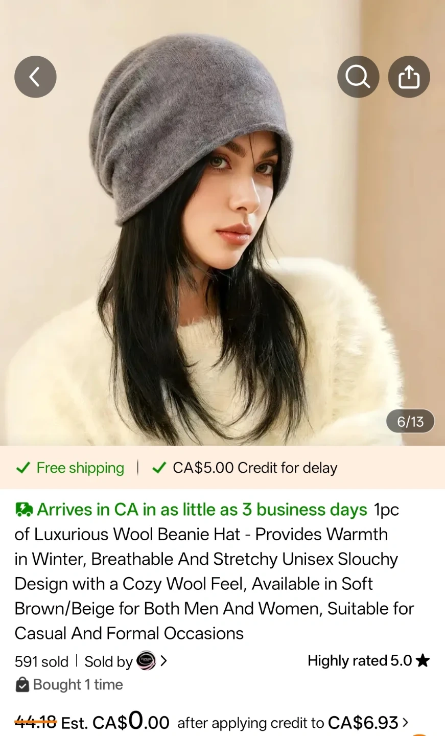 Selling a cozy unisex grey cashmere beanie. I bought two on Temu. It's $6.93. Highly Rated (5⭐) Luxurious Wool Beanie Hat - Provides Warmth in Winter, Breathable And Stretchy Unisex Slouchy Design with a Cozy Wool Feel. Both Men And Women, Suitable for Casual And Formal Occasions