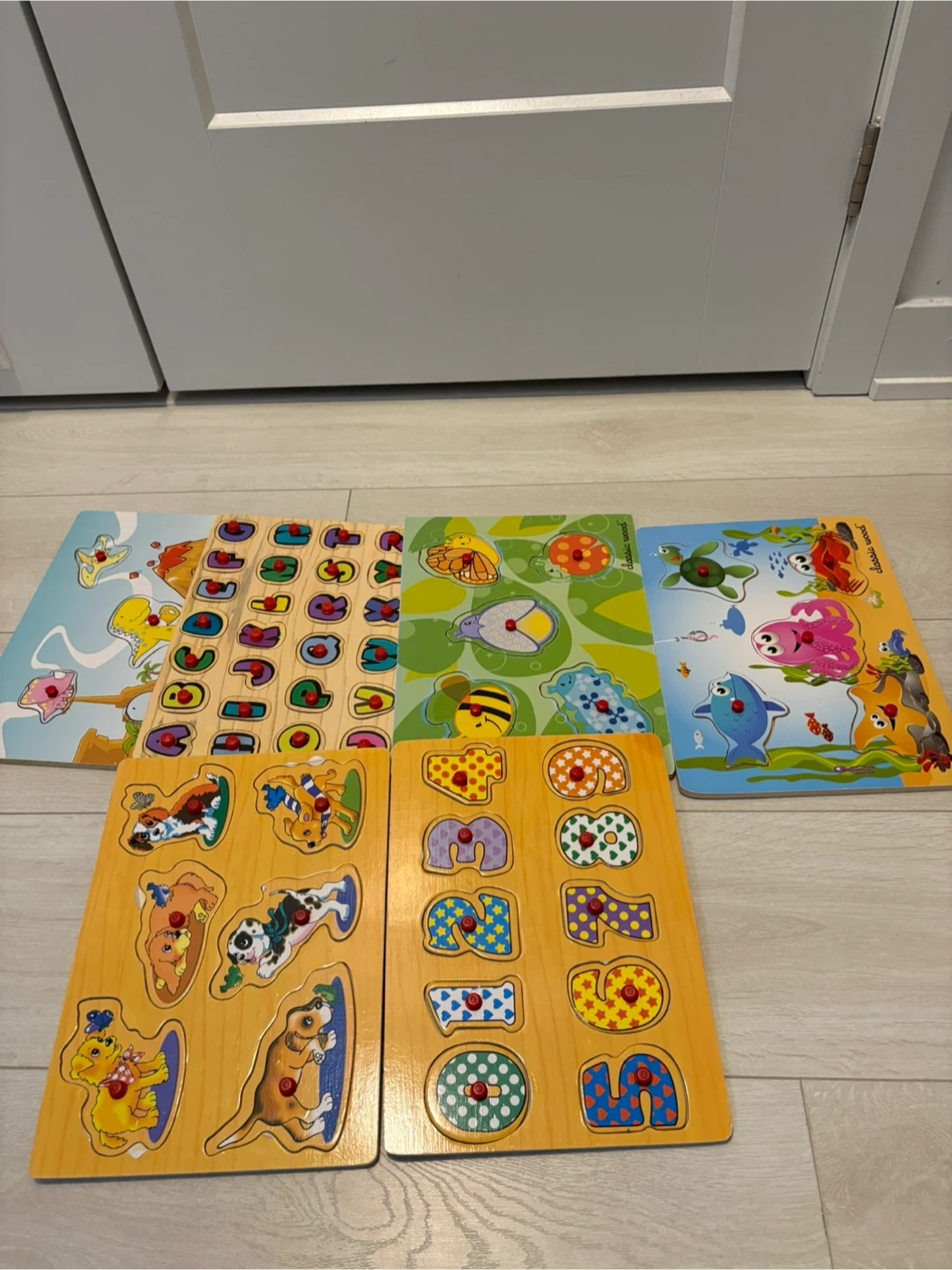 Selling a set of 5 Classic World wooden peg puzzles. These are great for toddlers learning about animals, numbers, and shapes. Each puzzle is in good condition and ready for a new home!