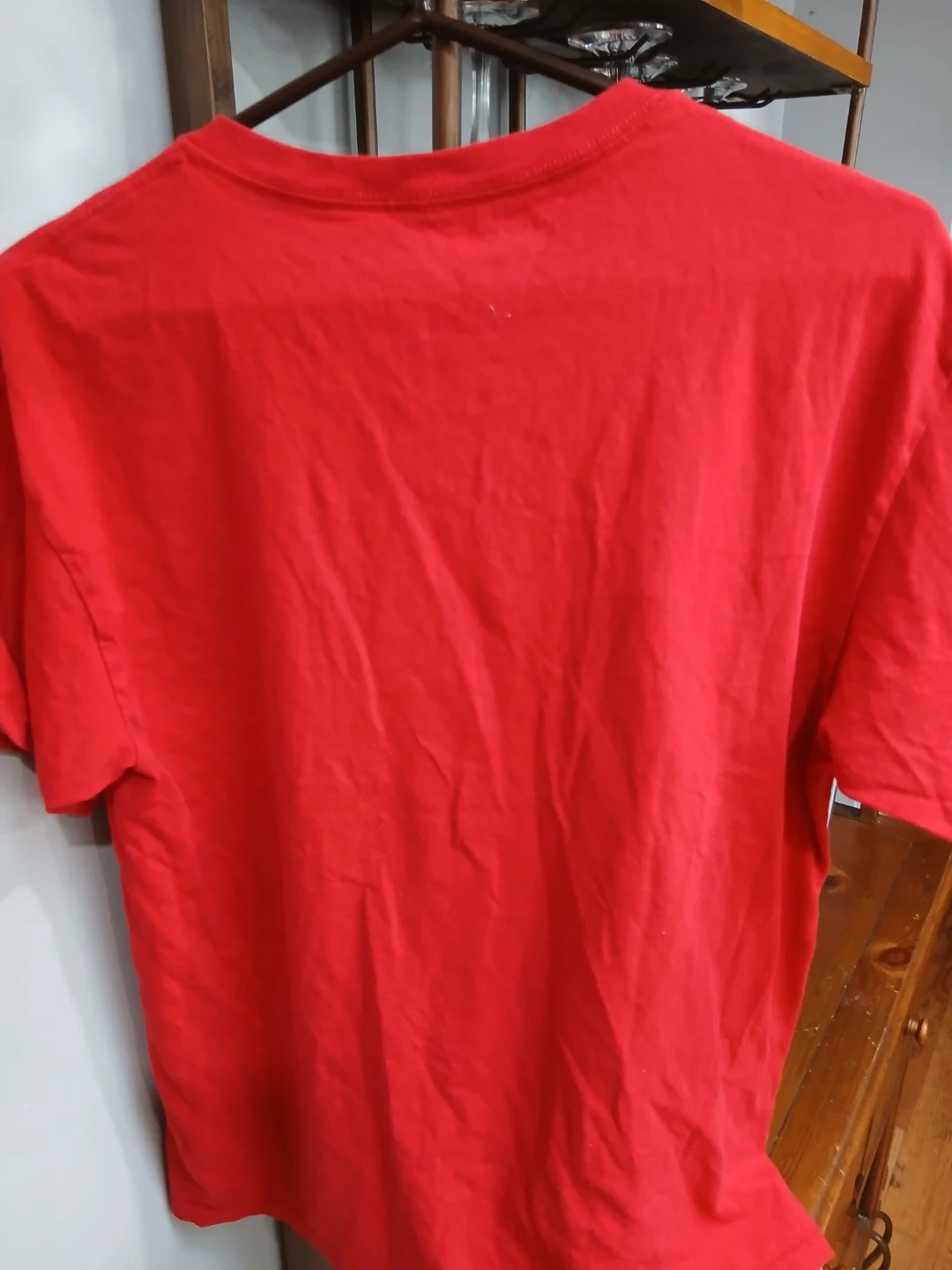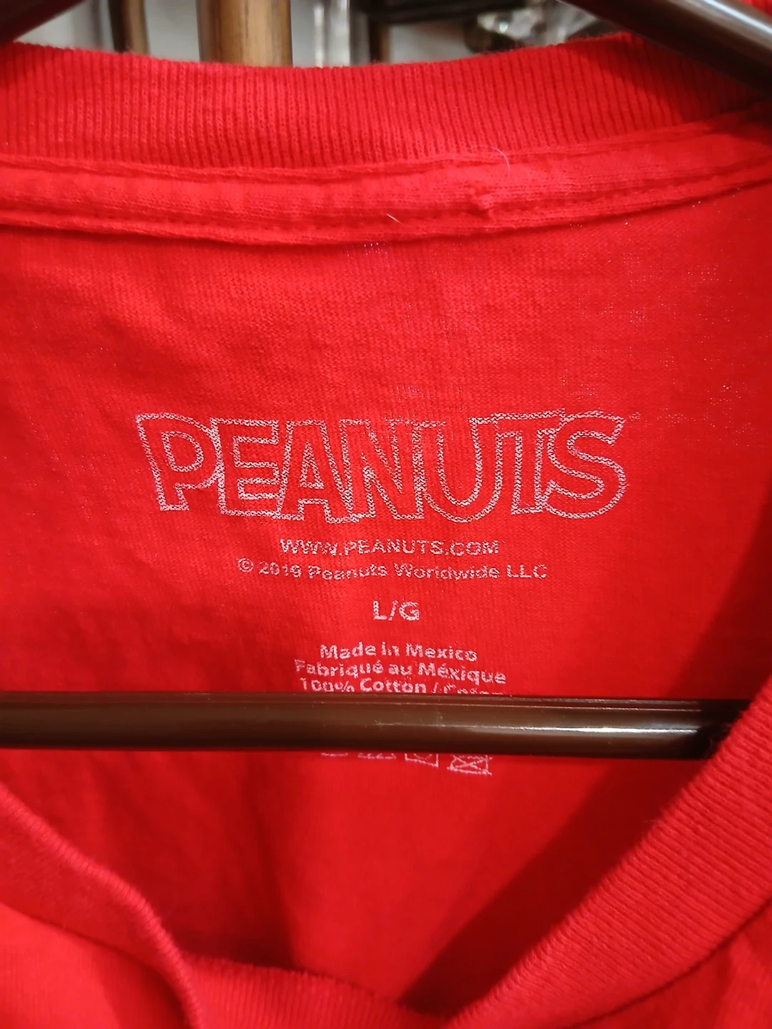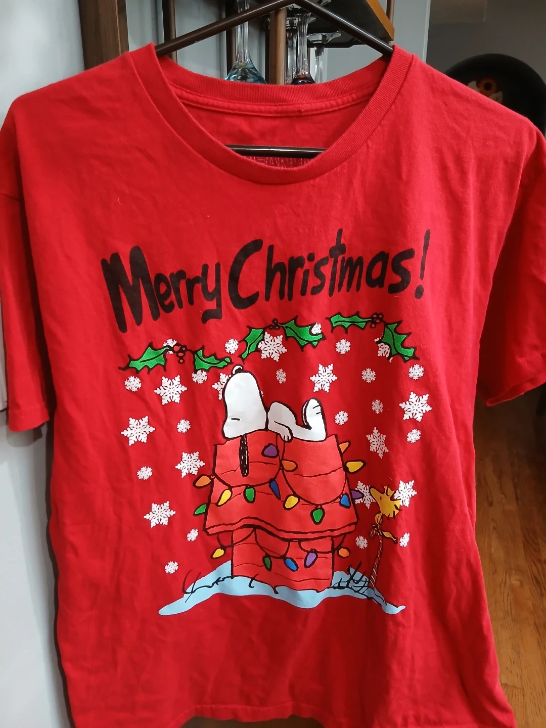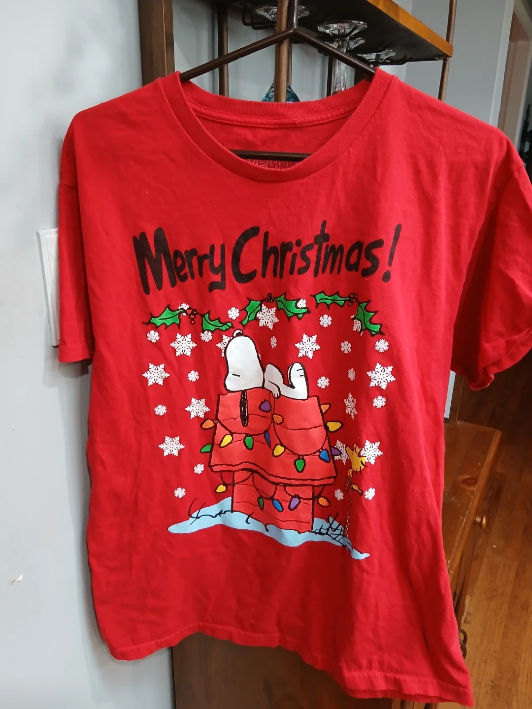 Get into the holiday spirit with this festive Peanuts t-shirt! It features Snoopy and Woodstock decorating Snoopy's dog house with Christmas lights. The shirt is a bright red and is a size large. Made from 100% cotton, it's comfy and perfect for the holiday season