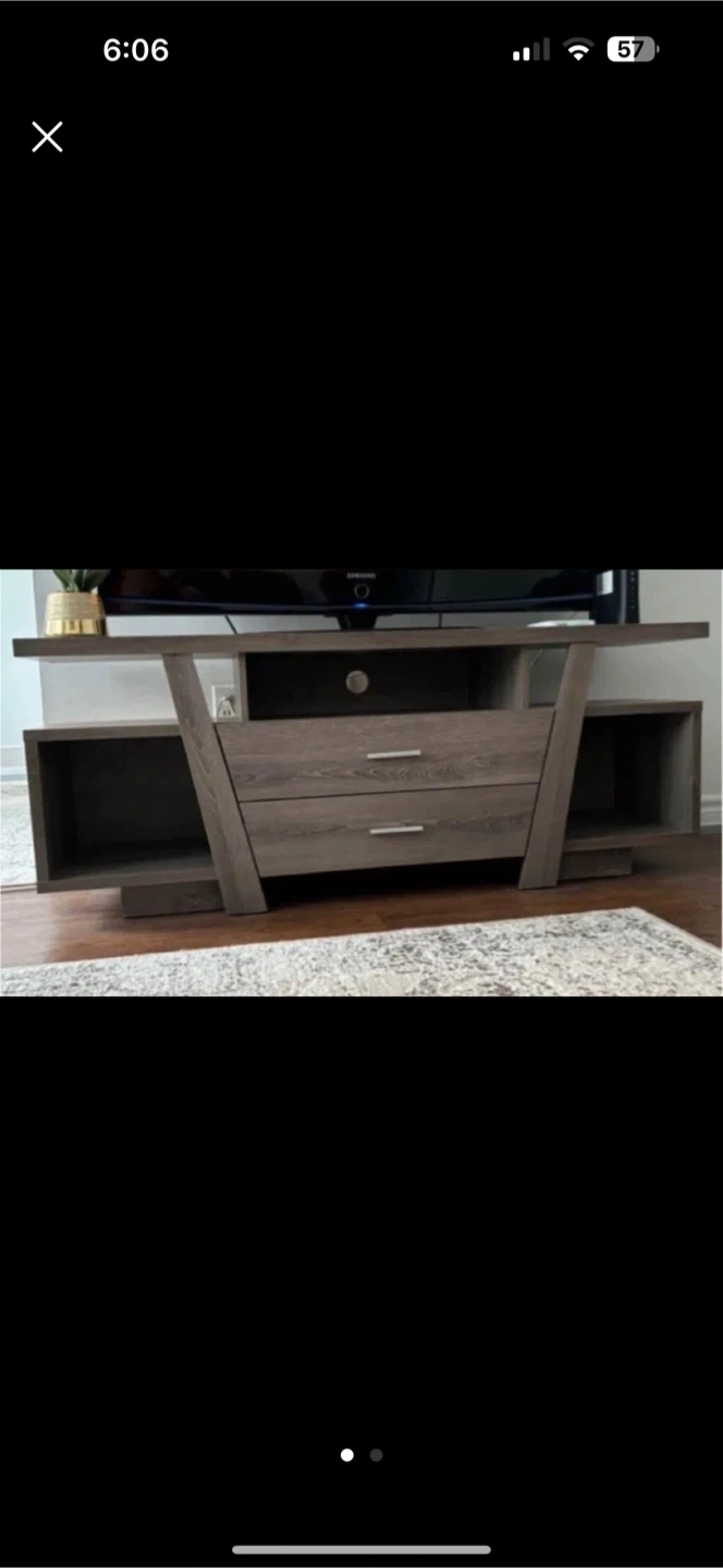 Selling a TV stand with a grey woodgrain finish. It features open shelving on the sides and two drawers in the middle for storage. Perfect for your living room or entertainment area!