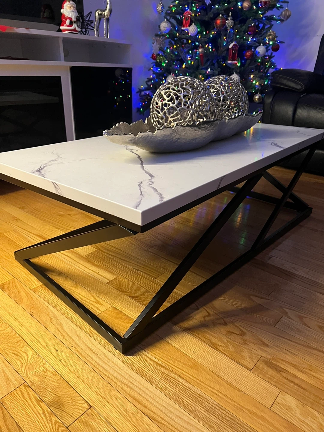 Selling a modern coffee table with a beautiful white marble top and a sleek, geometric black metal base. It's in great condition and would be a stylish addition to any living room!