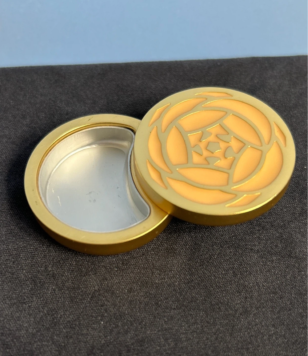 Perfume is gone but this collectable compact can hold your earrings or safe keep your tiny valuables! You can even put your other solid perfume in the and use it as its intended purpose.