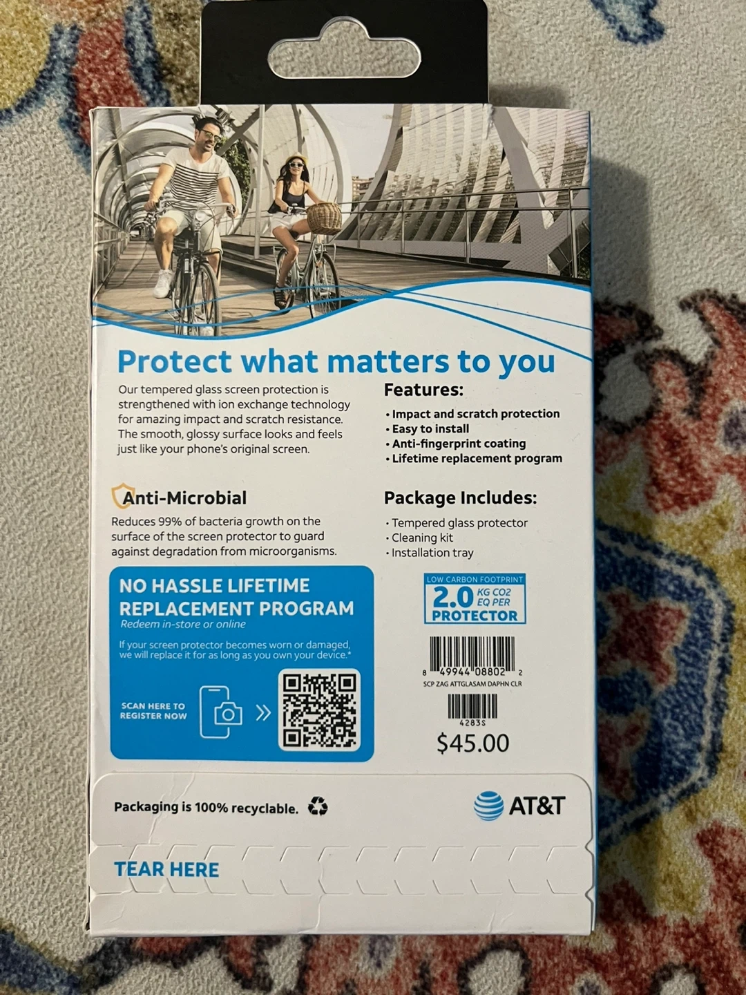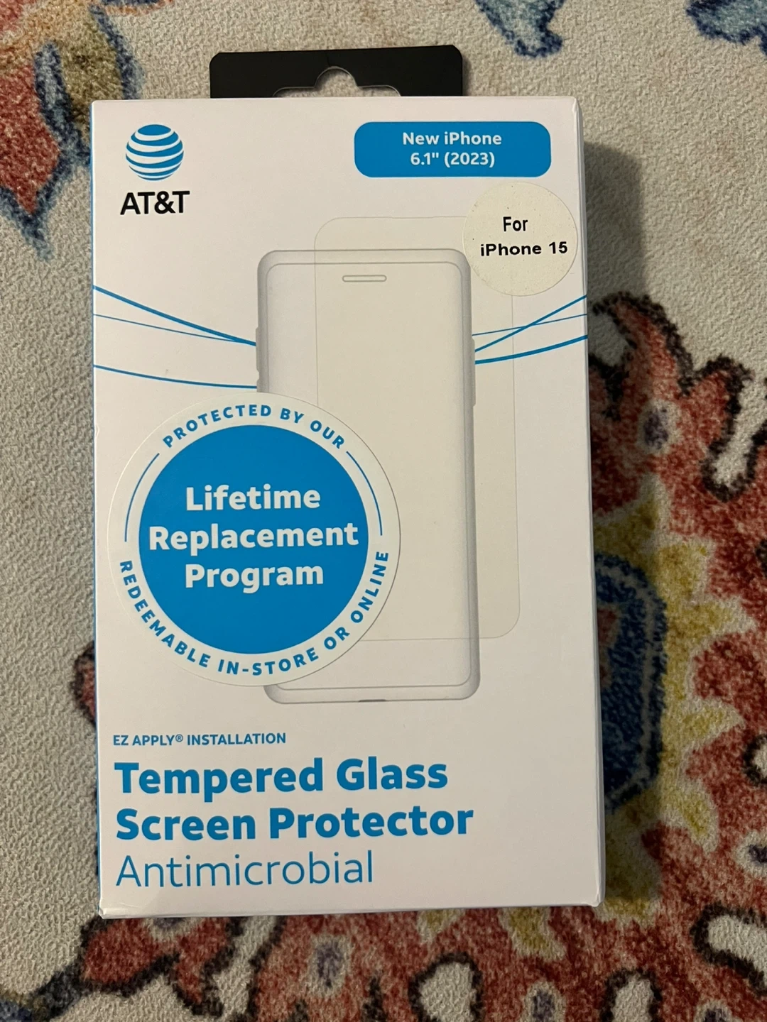 Selling a brand new AT&T tempered glass screen protector for the iPhone 15. This screen protector features impact and scratch protection, is easy to install, and has an anti-fingerprint coating. It also includes a lifetime replacement program! The package includes the tempered glass protector and an installation tray. Retails for $45.00