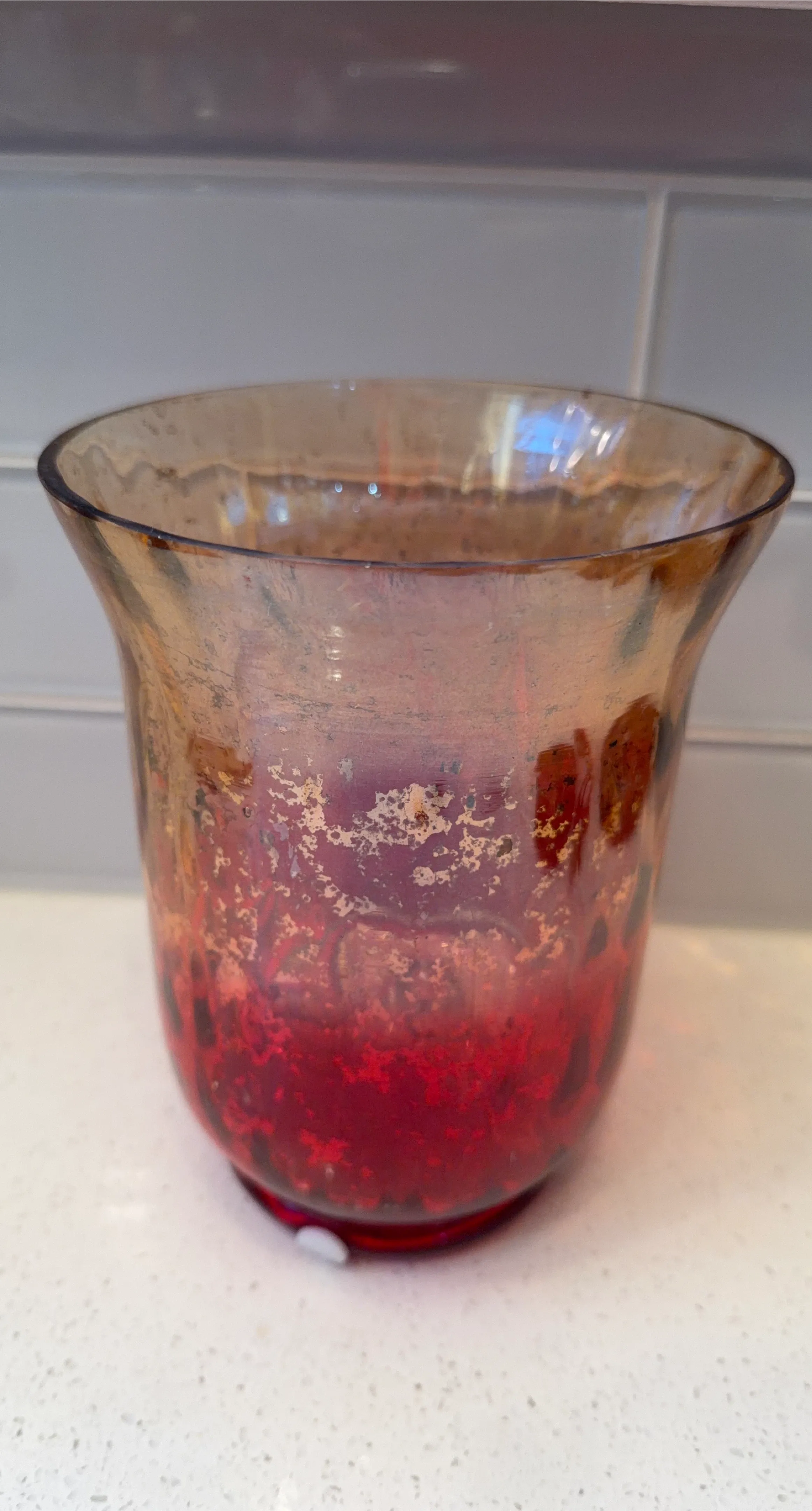 Here's a decorative candle holder, perfect for adding a touch of warmth to any room. It features a mix of red and gold colours, giving it a unique and stylish look. It's in good condition and ready to brighten up your space