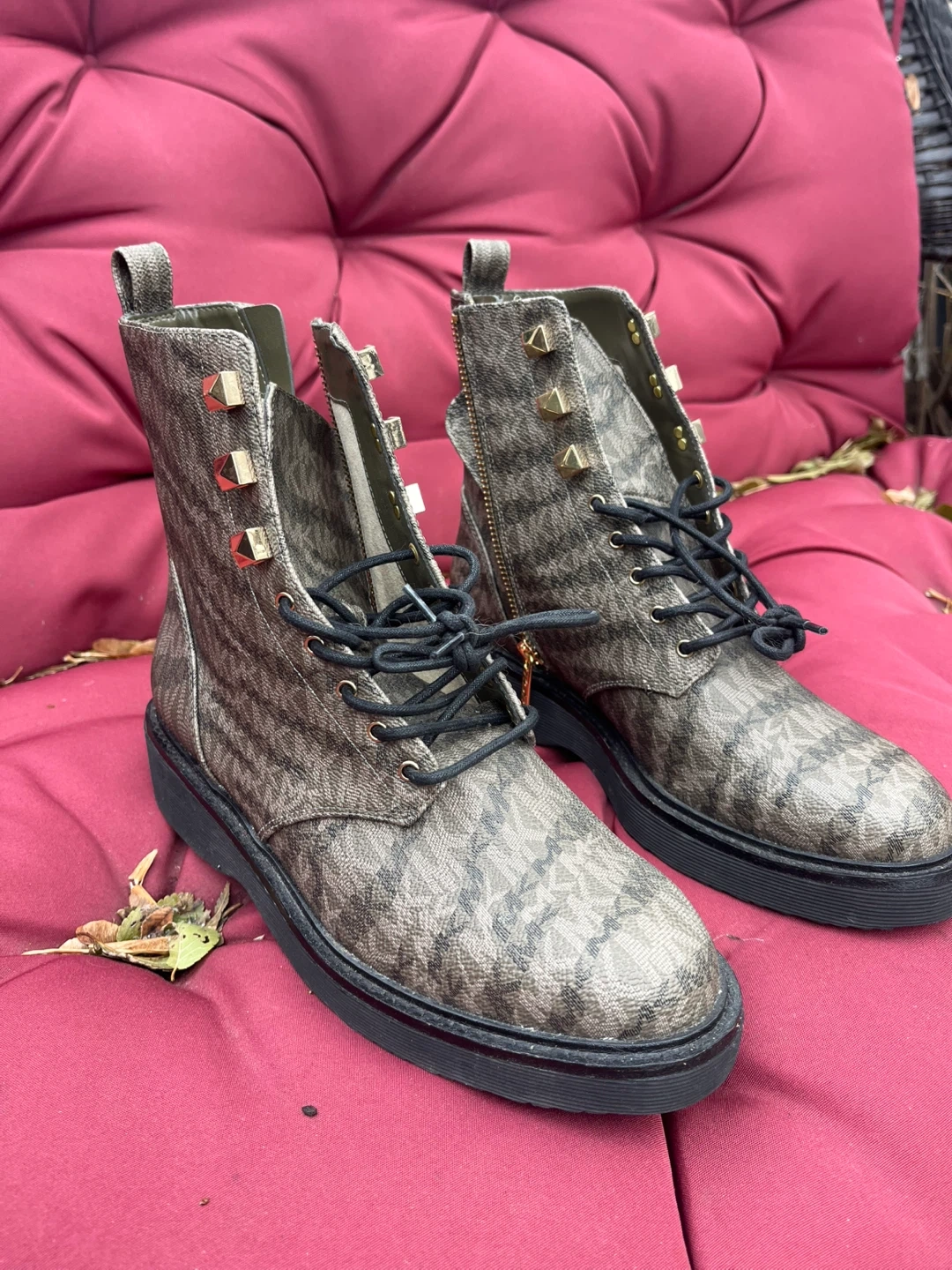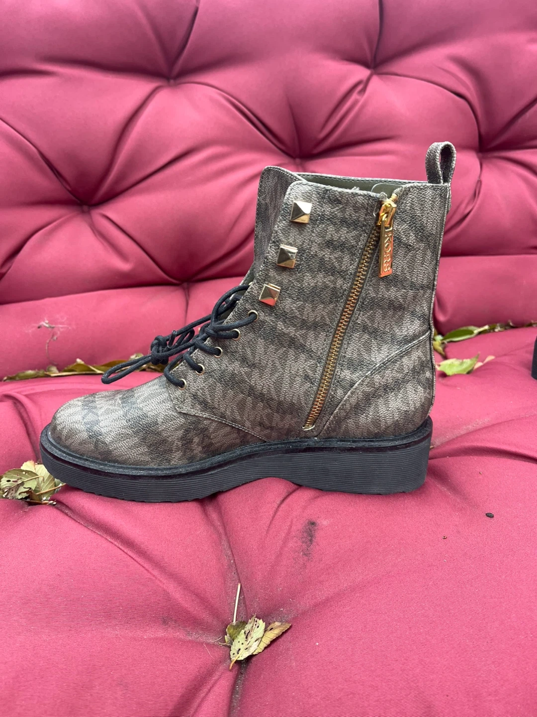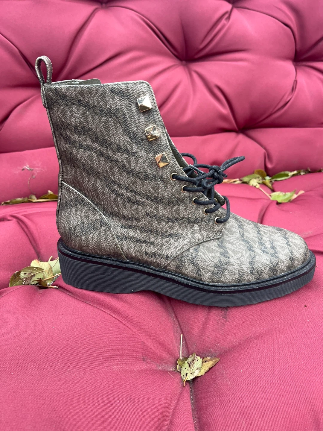 These are Michael Kors Bryce Lug Boots in a size 7! They feature a cool MK logo pattern and a side zipper. Perfect for adding some edge to your wardrobe!