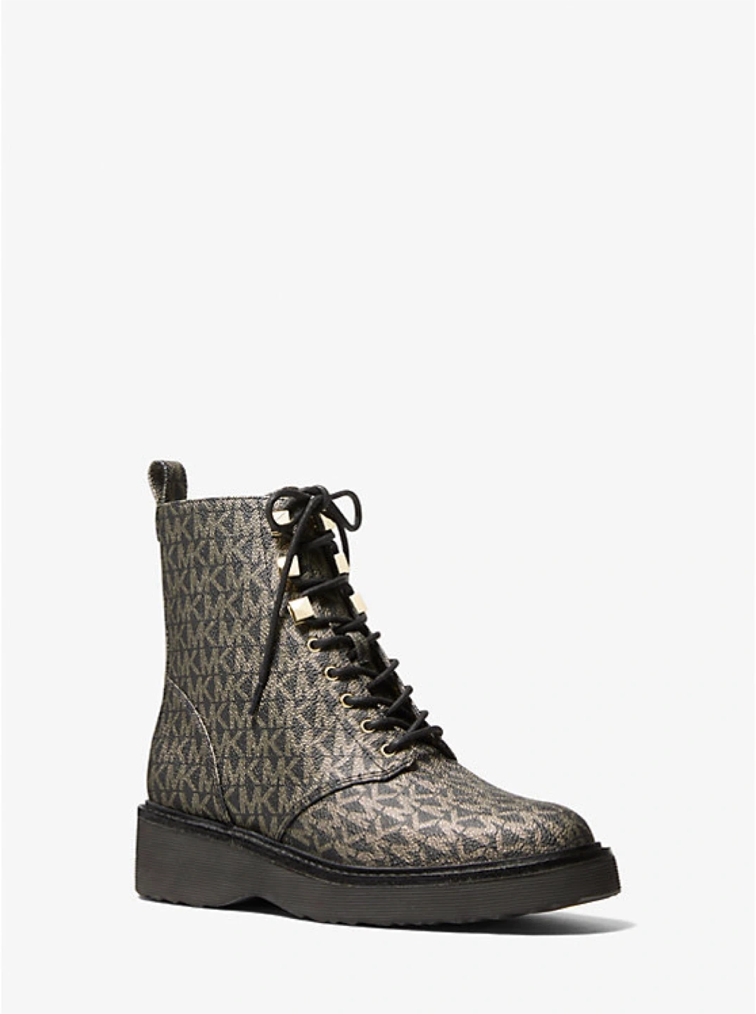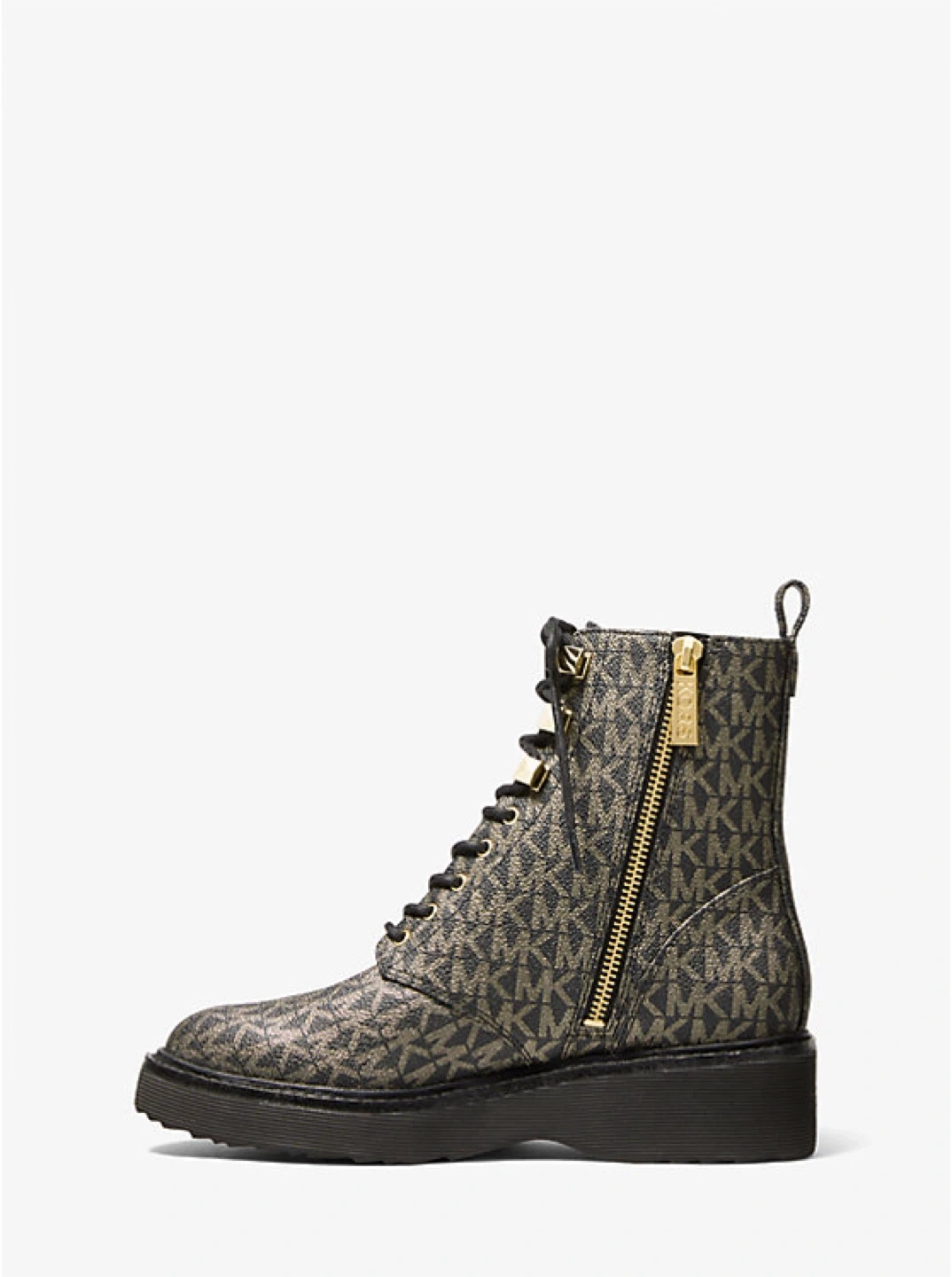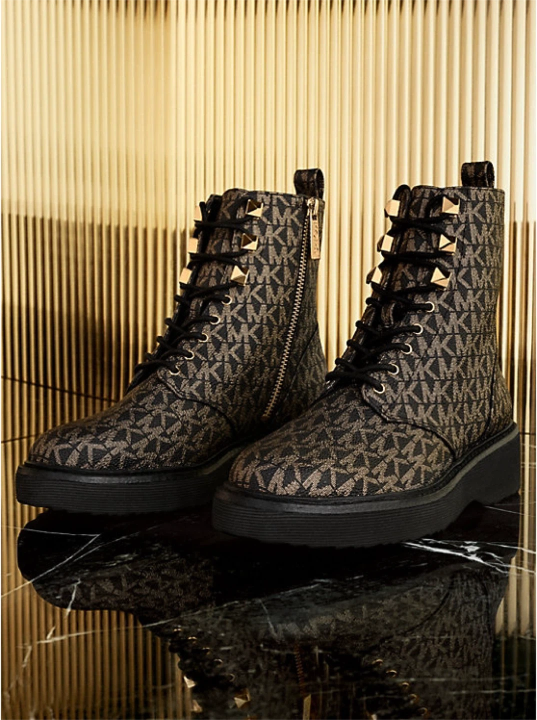 These are Michael Kors Bryce Lug Boots in a size 7! They feature a cool MK logo pattern and a side zipper. Perfect for adding some edge to your wardrobe!