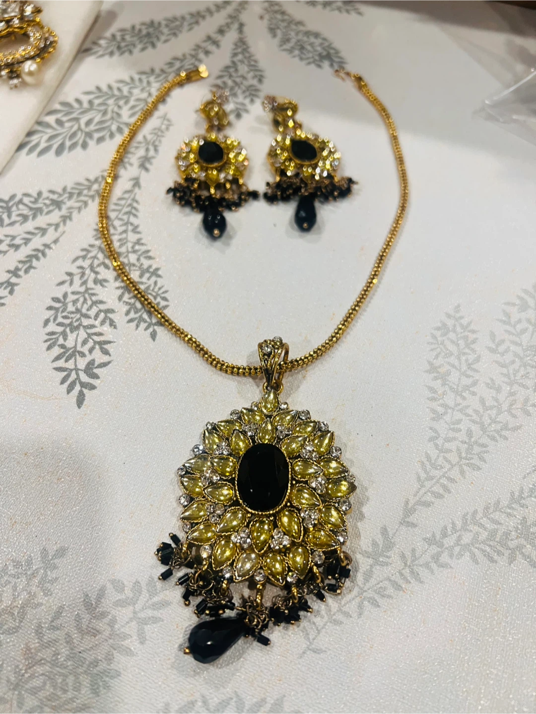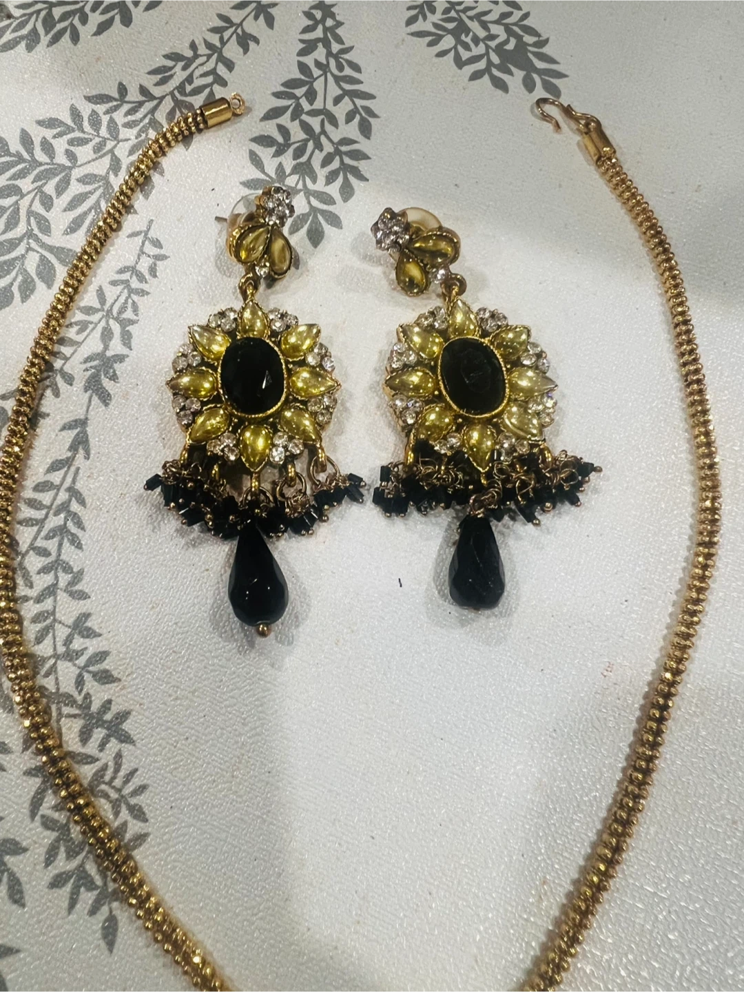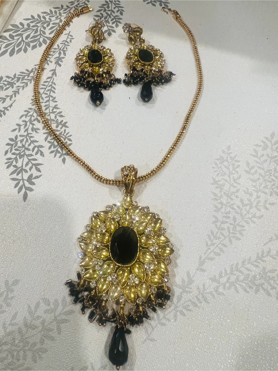 Beautiful necklace and earring set with black stone accents. The set is in great condition and would be a lovely addition to any jewellery collection!