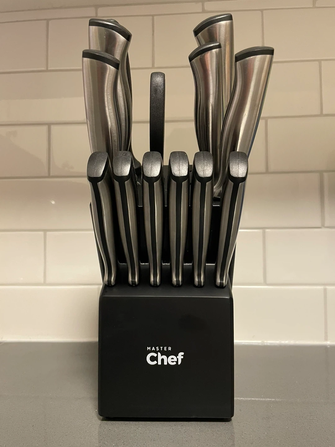 Selling a Master Chef knife block set. It includes various knives and a block to store them. Great for any kitchen!