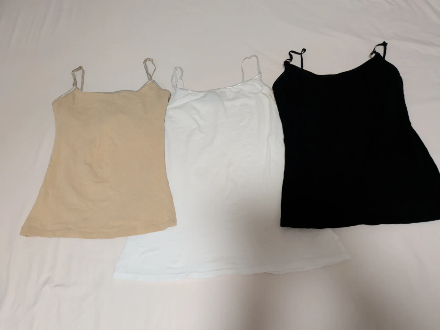 Selling a set of cami tank tops in beige, white, and black! They're in great condition and perfect for layering or wearing on their own. A versatile addition to any wardrobe!