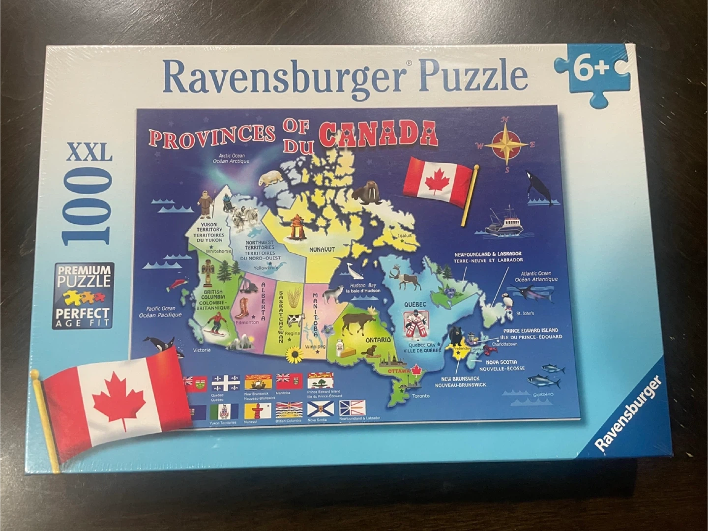 Selling a Ravensburger Provinces of Canada puzzle! It's a 100 XXL piece puzzle, perfect for ages 6+. The puzzle is still sealed in its original packaging