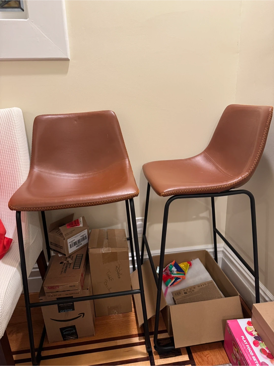 Selling a set of two stylish bar stools! They feature a comfortable brown faux leather seat and sleek black metal legs. They're in great condition and would look great in any kitchen or bar area. Basically brand new never used. Don't miss out!