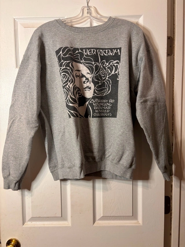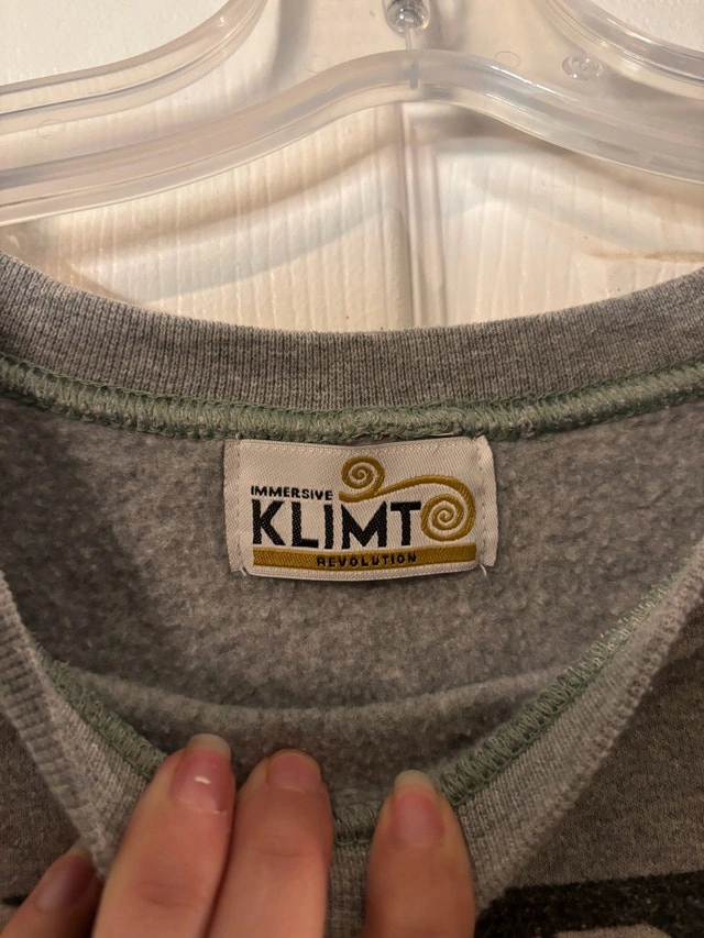 $35 or best offer - Grey crewneck sweatshirt purchased at the Toronto Immersive Klimt exhibit (Lighthouse Immersive). Features a Gustav Klimt–inspired Ver Sacrum Vienna Secession graphic.