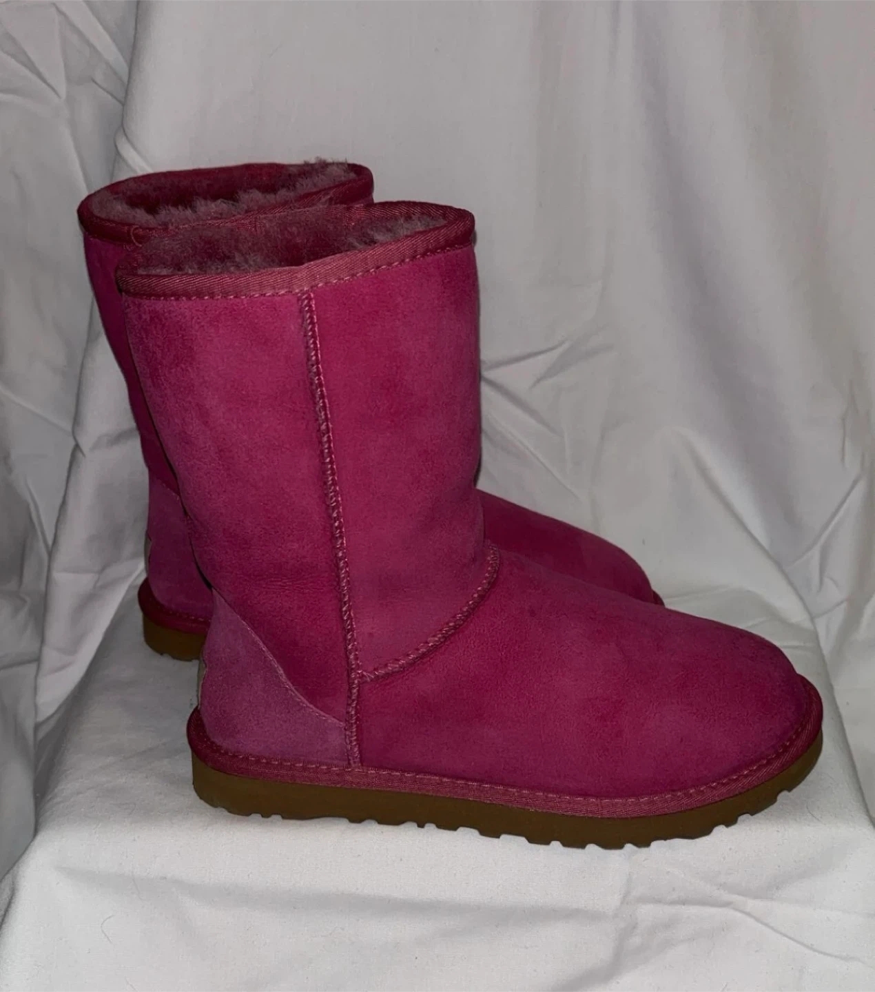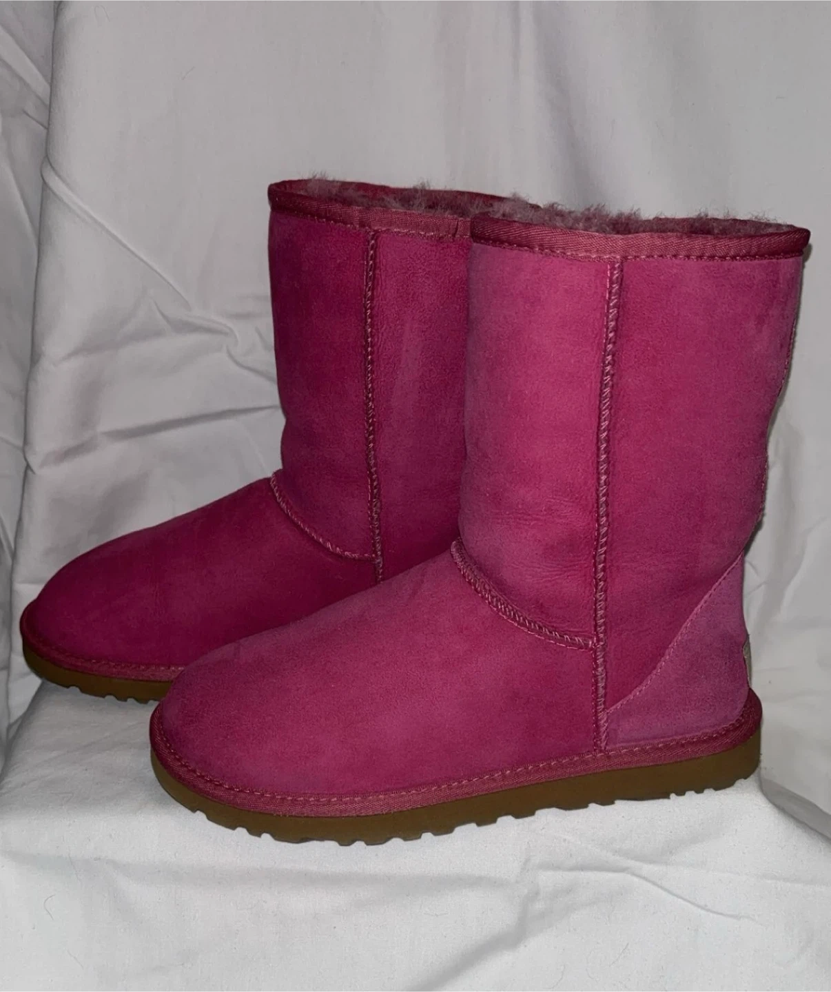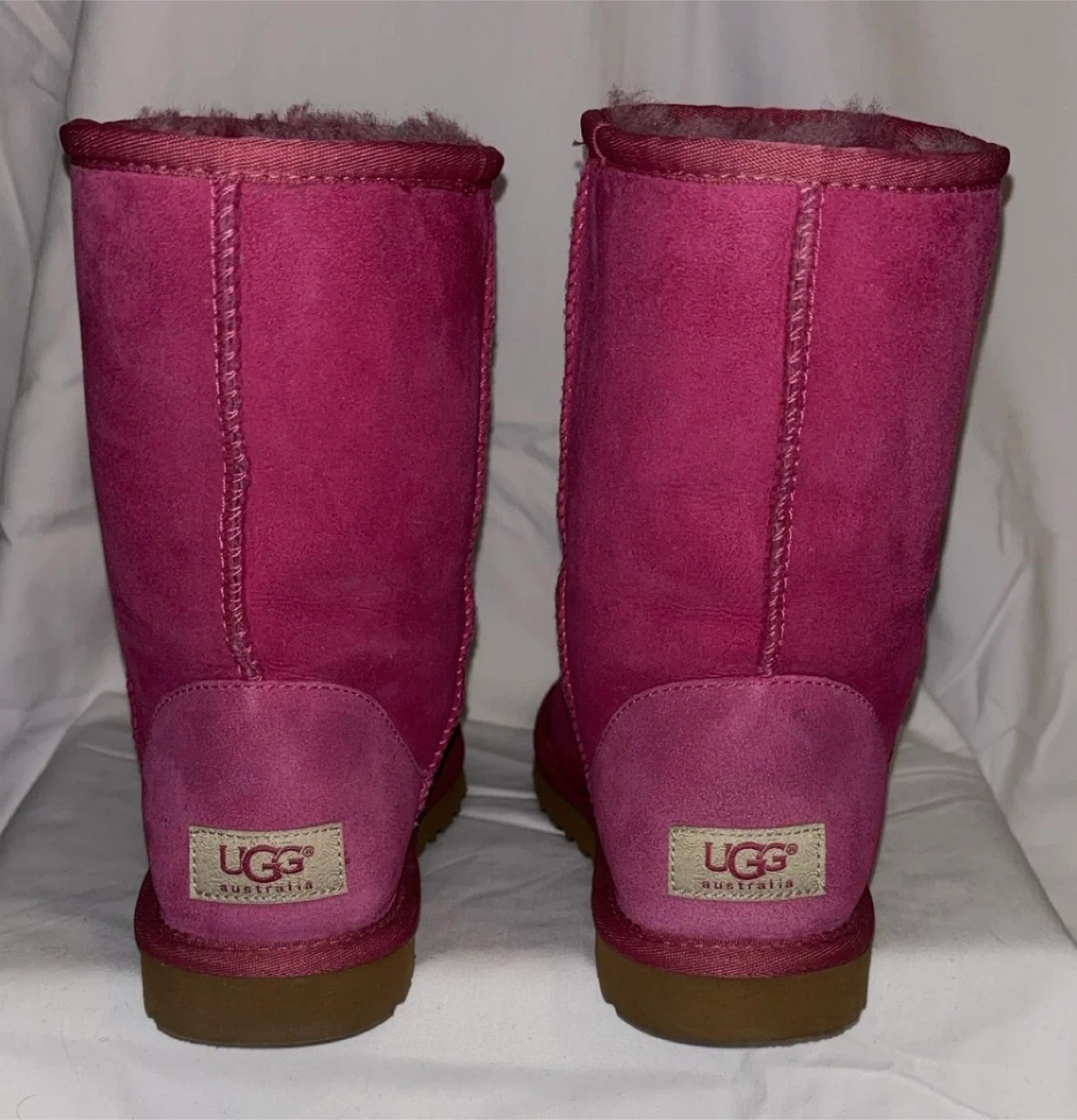 UGG Short Classic Boots - Fuchsia -Size 6 Women’s (I am a size 8). Please note there is a tiny hole at the bottom from a piece of salt and a mark on the front as shown in photo. $50 cash. Porch pick up Kennedy and eglinton