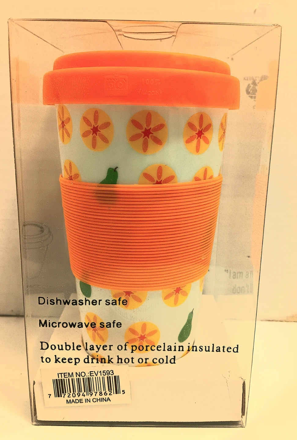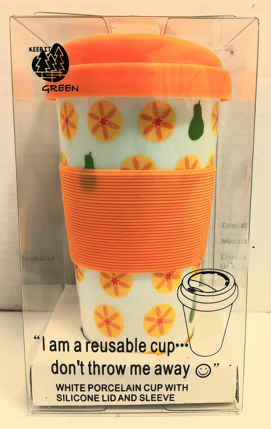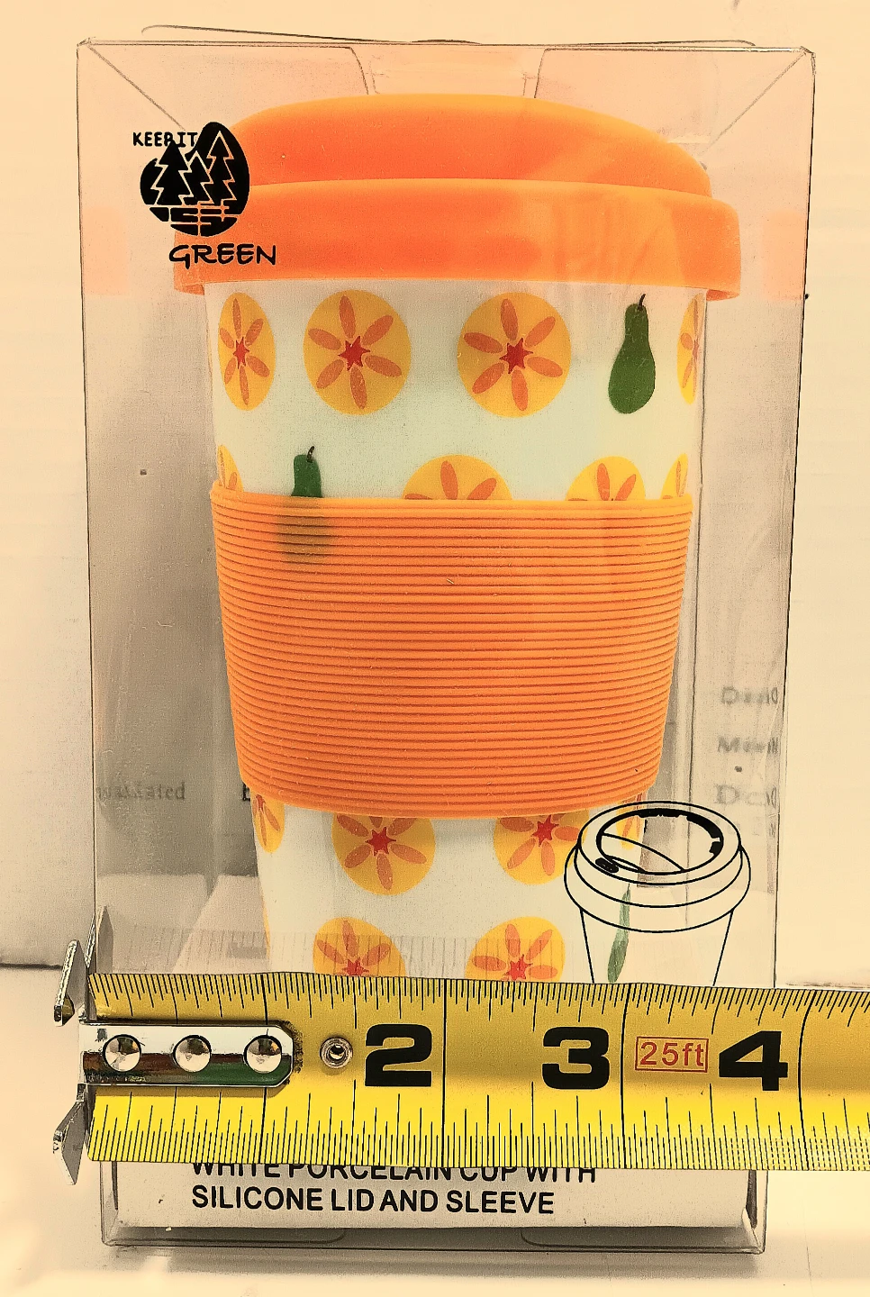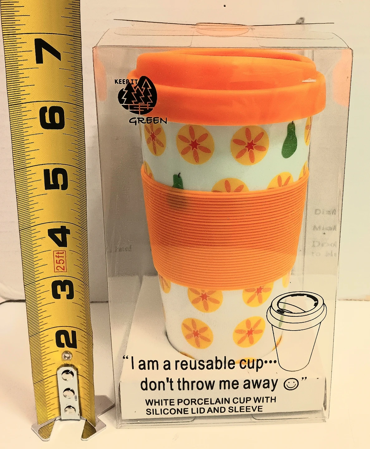 This Keep It Green cup is a delightful way to enjoy your favourite beverages on the go! The cup features a white porcelain body adorned with a charming fruit pattern and is equipped with a bright orange silicone lid and sleeve for a comfortable grip and insulation. It's in new condition, nestled in its original packaging, waiting to be part of your daily routine.