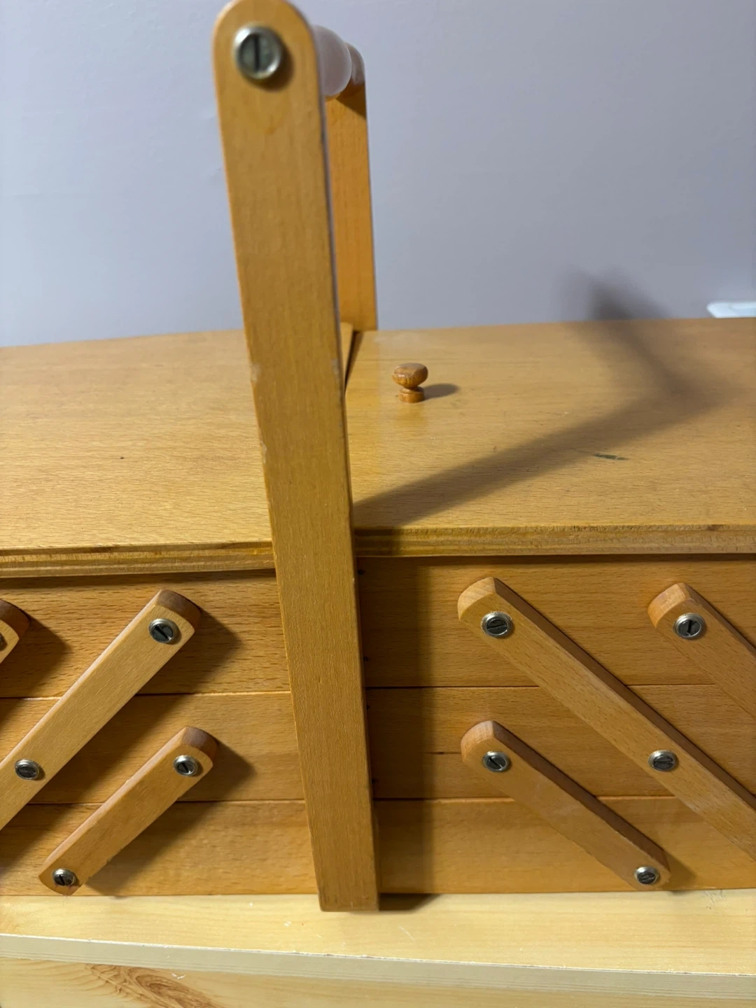 Selling a wooden sewing box in good condition. It's perfect for storing all your sewing supplies and keeping them organized. The box features multiple compartments and a handle for easy carrying