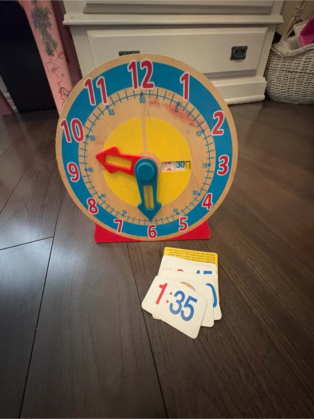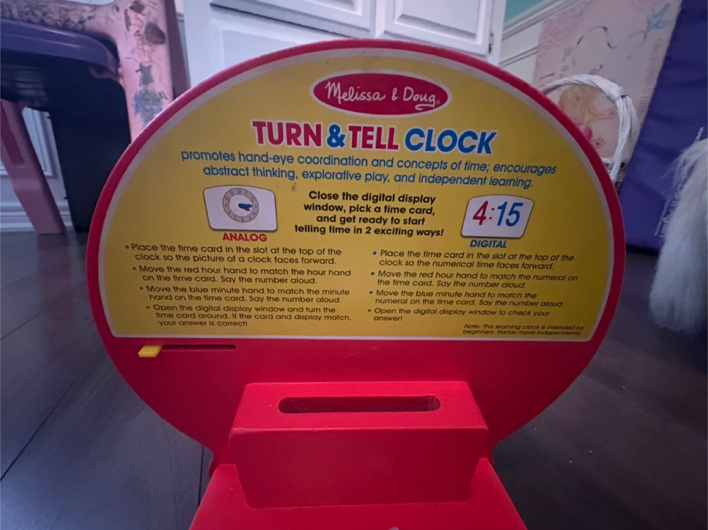 I'm selling a Melissa & Doug Turn & Tell Clock. It promotes hand-eye coordination and concepts of time. It encourages abstract thinking, explorative play, and independent learning. It has both analog and digital ways to tell time.