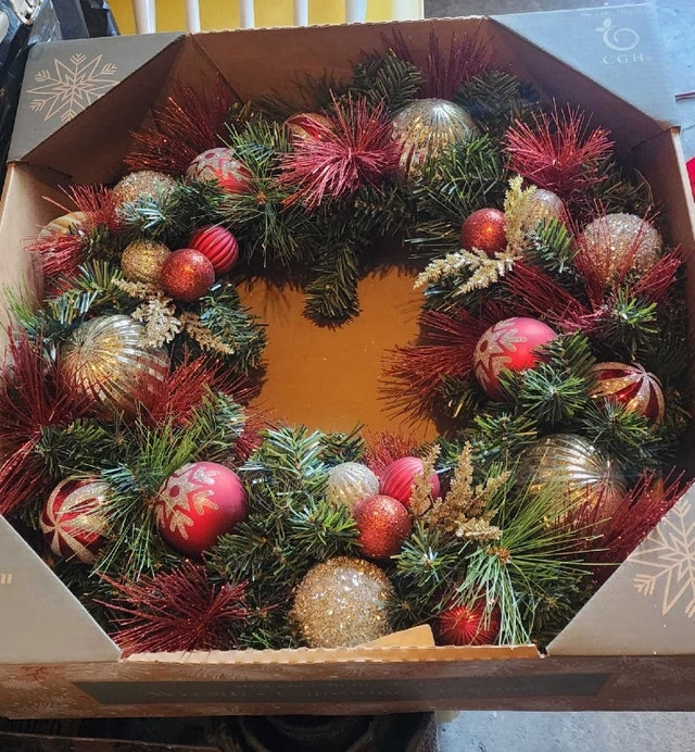 Add some holiday cheer with this festive CGH Christmas wreath! This wreath is adorned with red and gold ornaments and is perfect for adding a touch of Christmas to your front door or mantel. The wreath is in good condition, ready to spread holiday joy, and looking for a new home to deck the halls. While I don't have precise specifications, its vibrant colours and classic design make it a wonderful addition to any holiday decor. Given its condition and style, I'm pricing it at $30. If the ad is still up, then yes, it's still available!