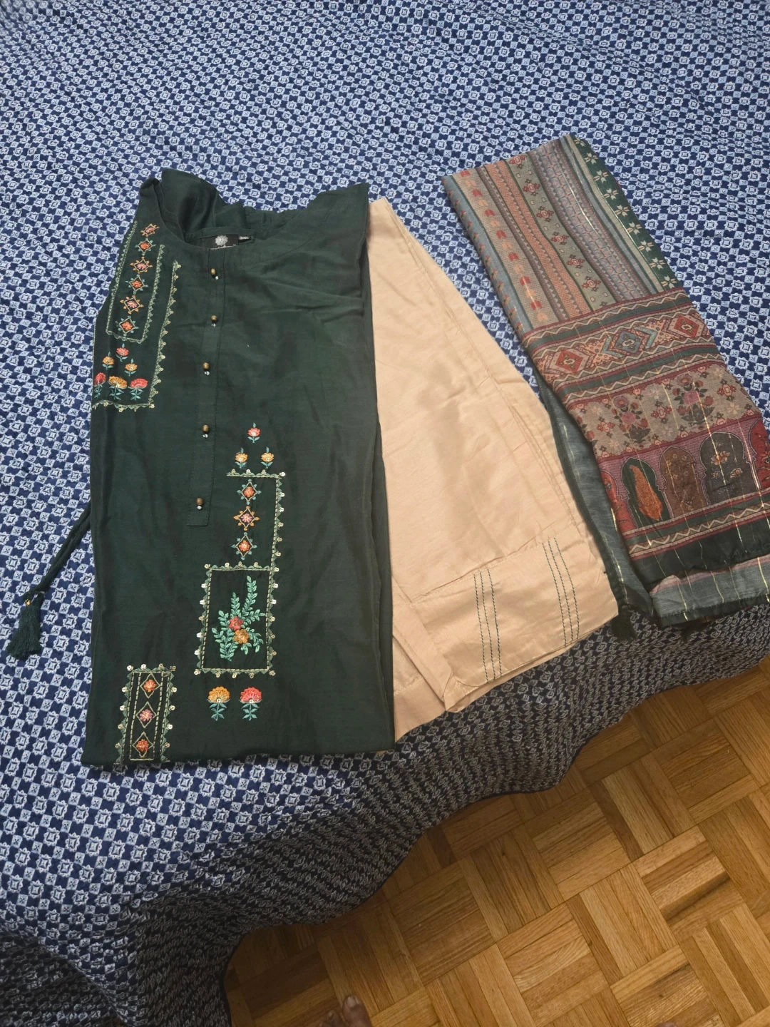 Selling a beautiful Indian suit set. The set includes a dark green embroidered top, light beige pants, and a patterned dupatta. It's in great condition and perfect for any occasion!