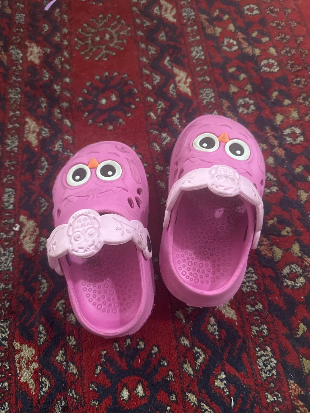 - Pink owl-themed clogs