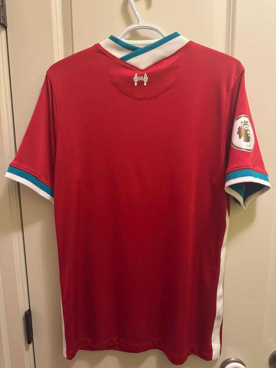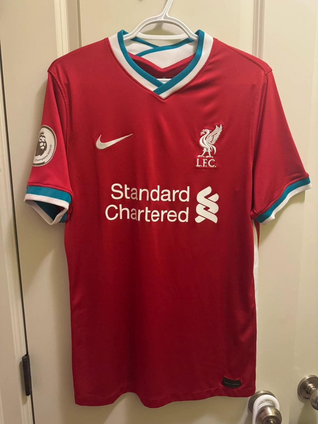 Selling a Liverpool FC jersey by Nike! It's in great shape and ready for a new fan. Features the Standard Chartered logo and the Premier League Champions badge on the sleeve. Perfect for showing your support!
