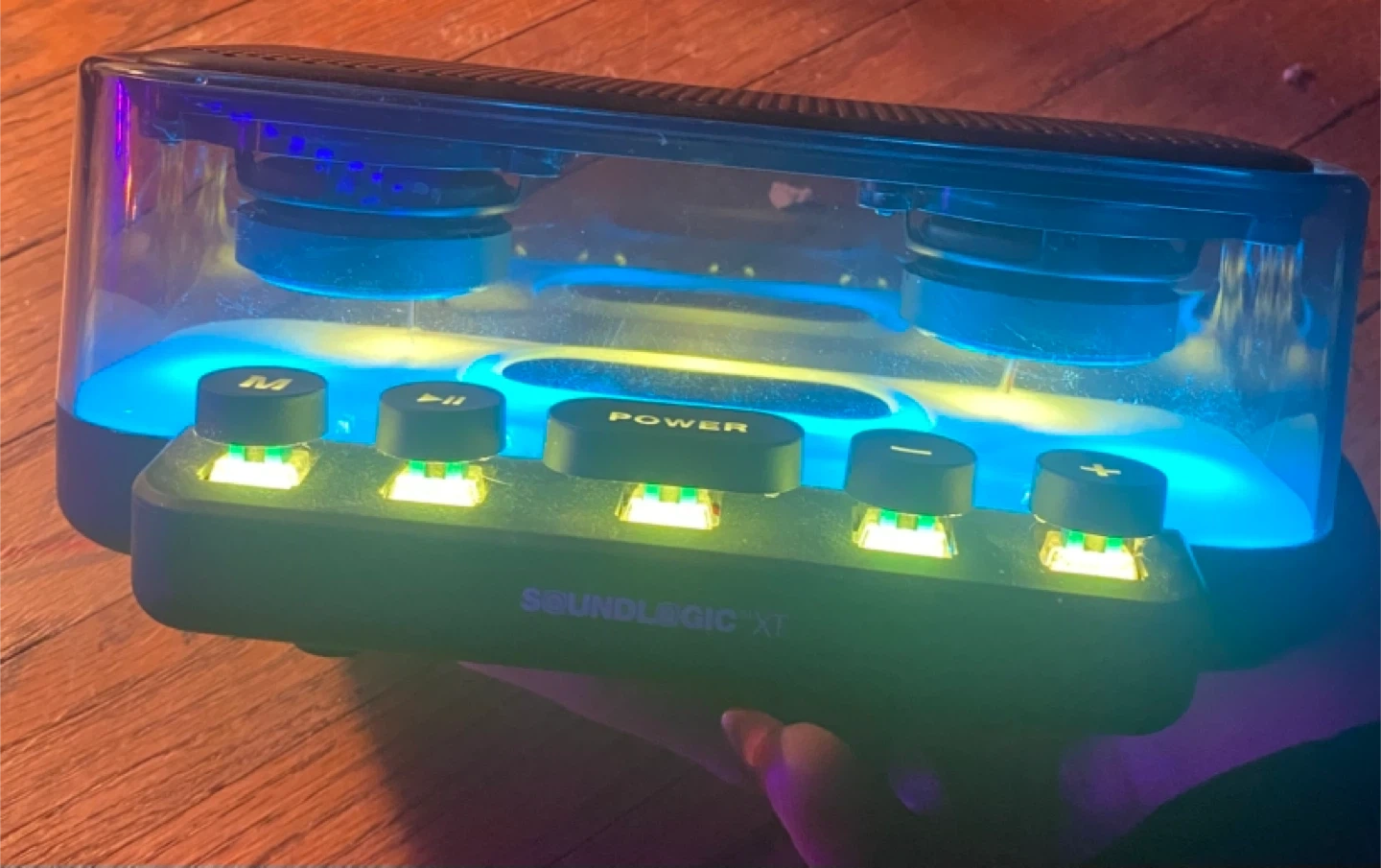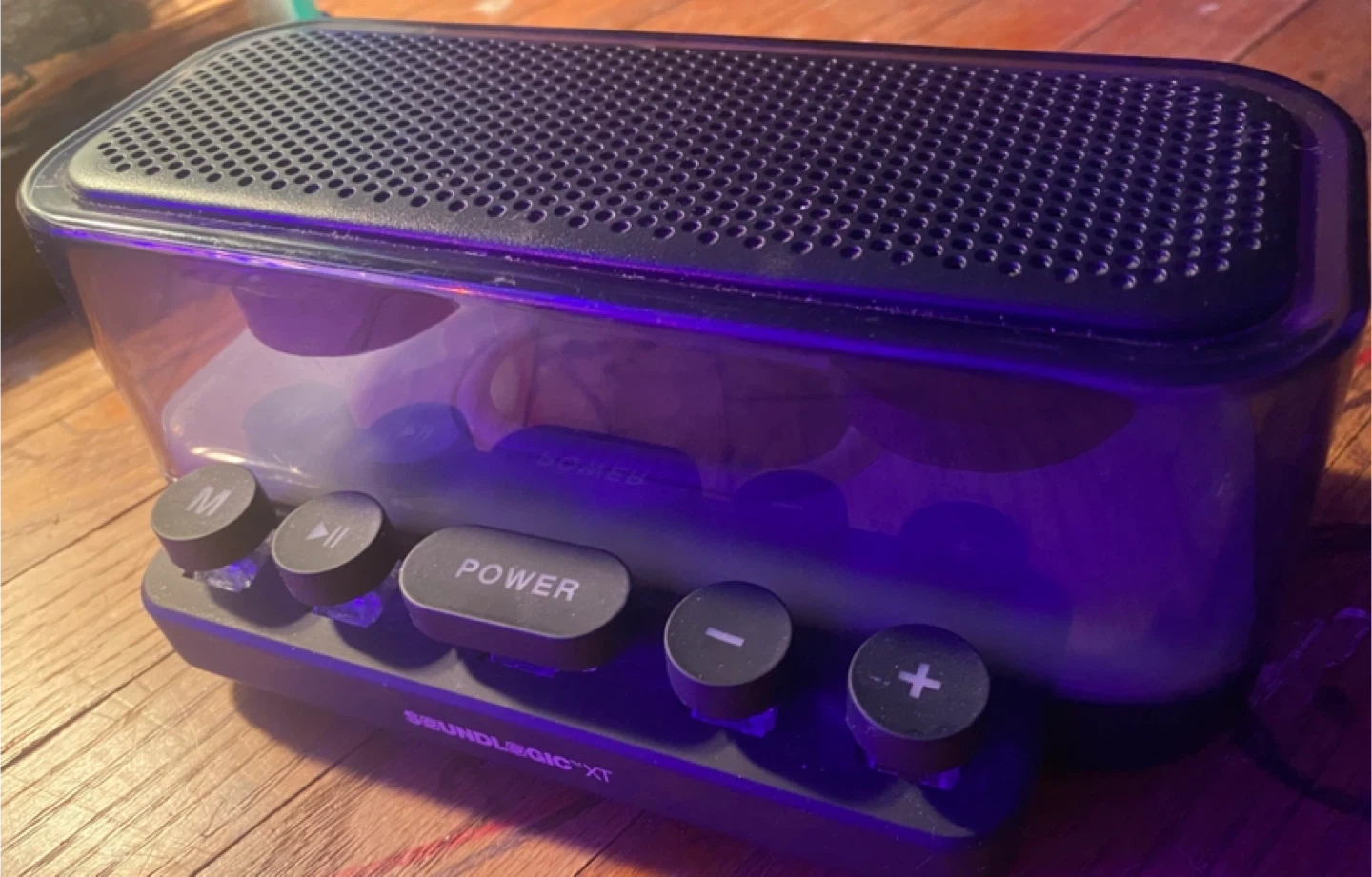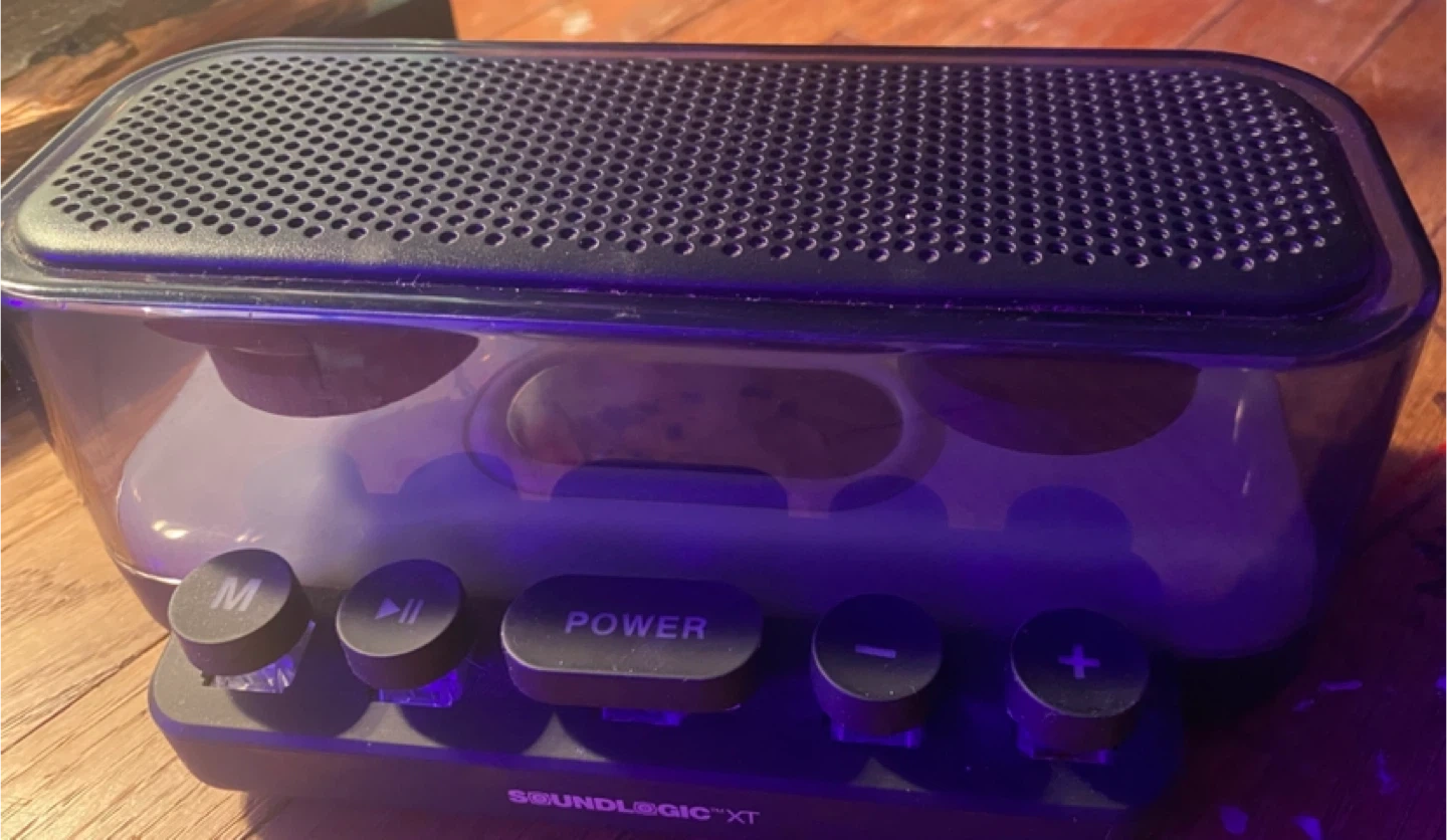Check out this cool Soundlogic XT Bluetooth speaker! It lights up with different colours, which makes it a fun addition to any room. It's in great shape and ready to play your favourite tunes