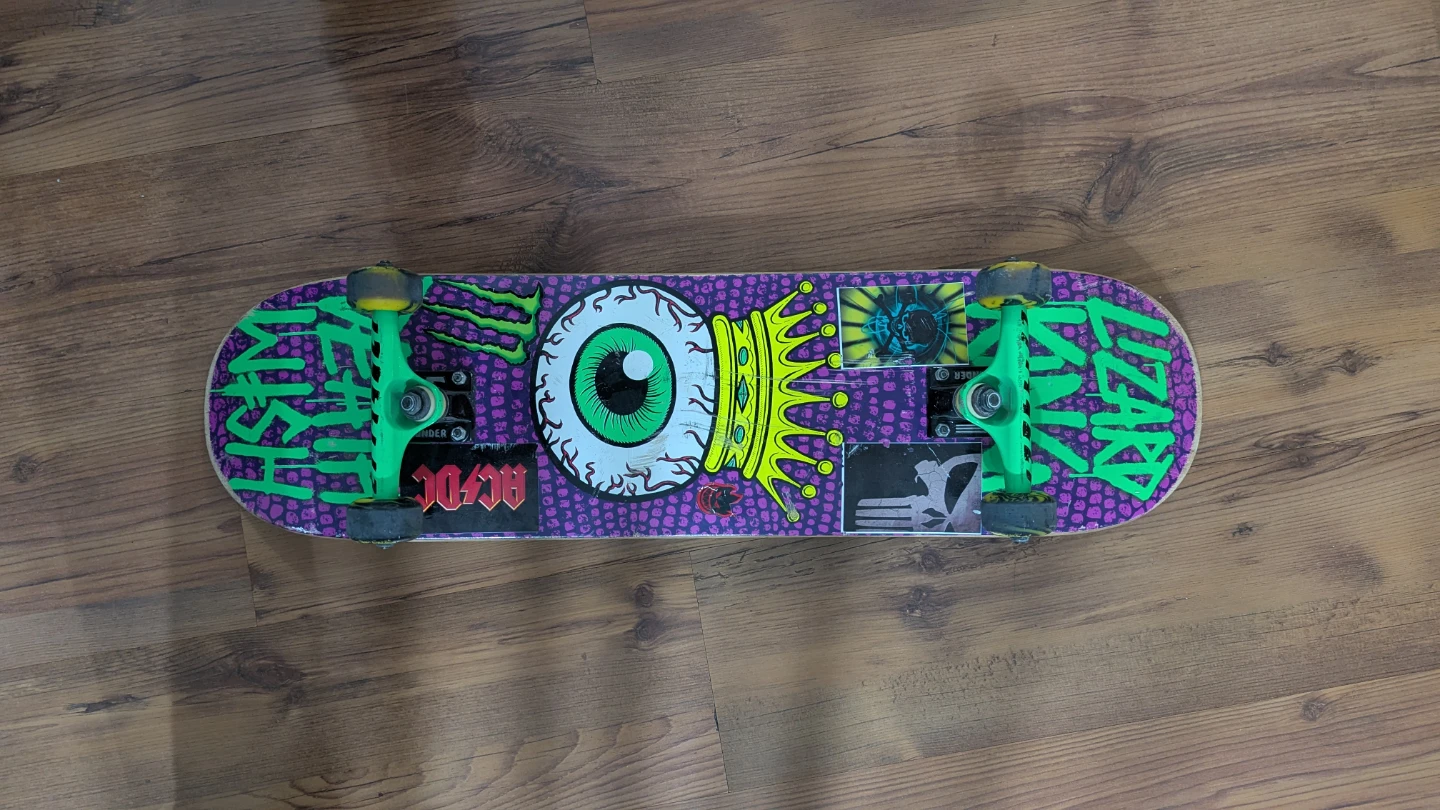 Selling a used *Rare Deck* Lizard King skateboard. It has green trucks and black wheels with yellow designs with Bones Reds bearings. Great for someone looking to get into skateboarding!