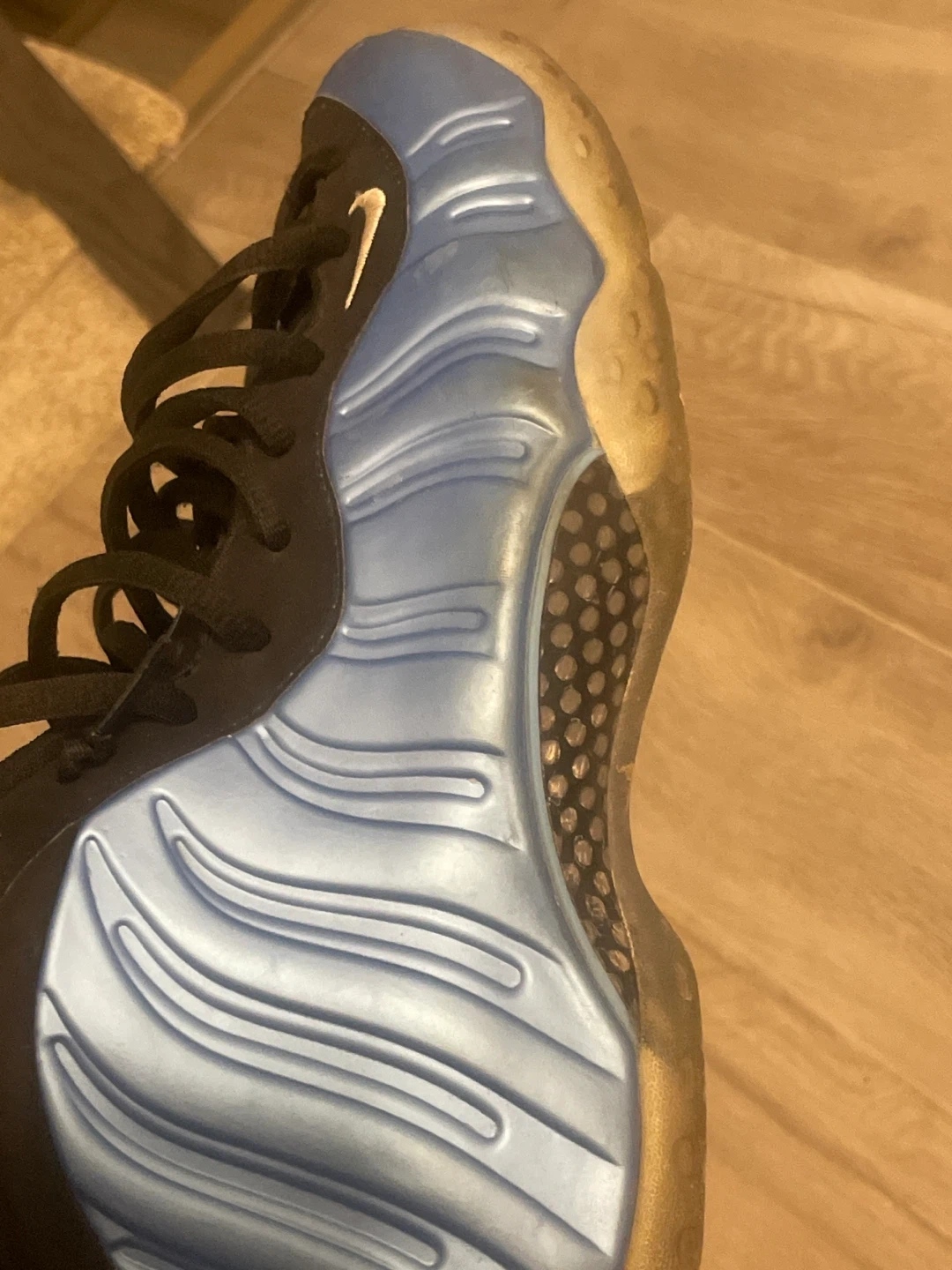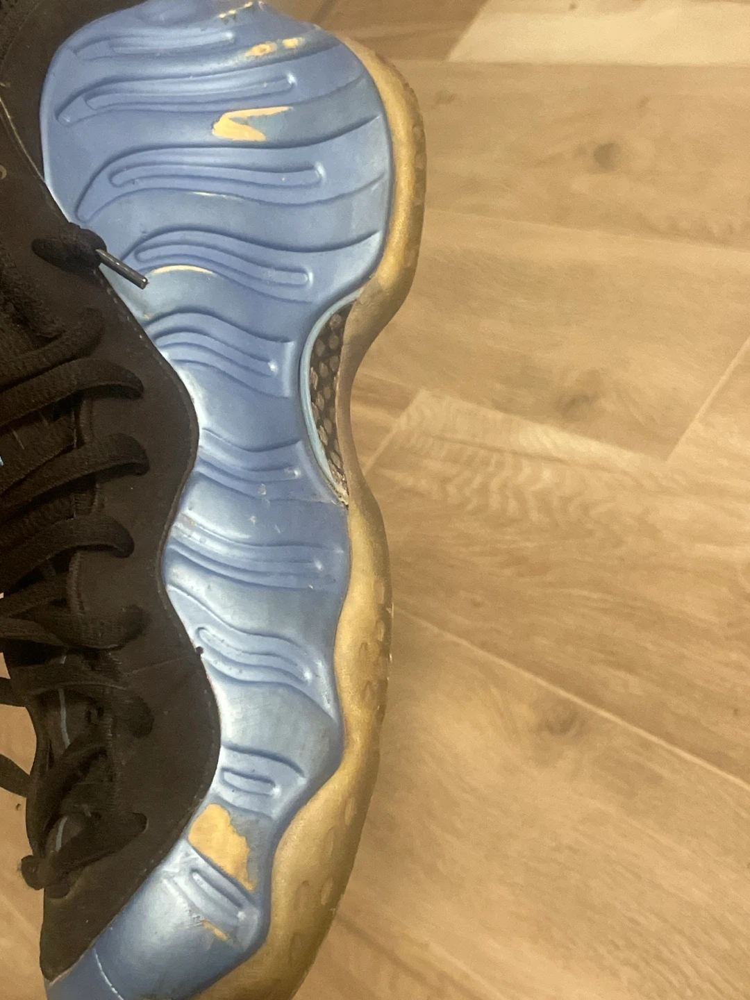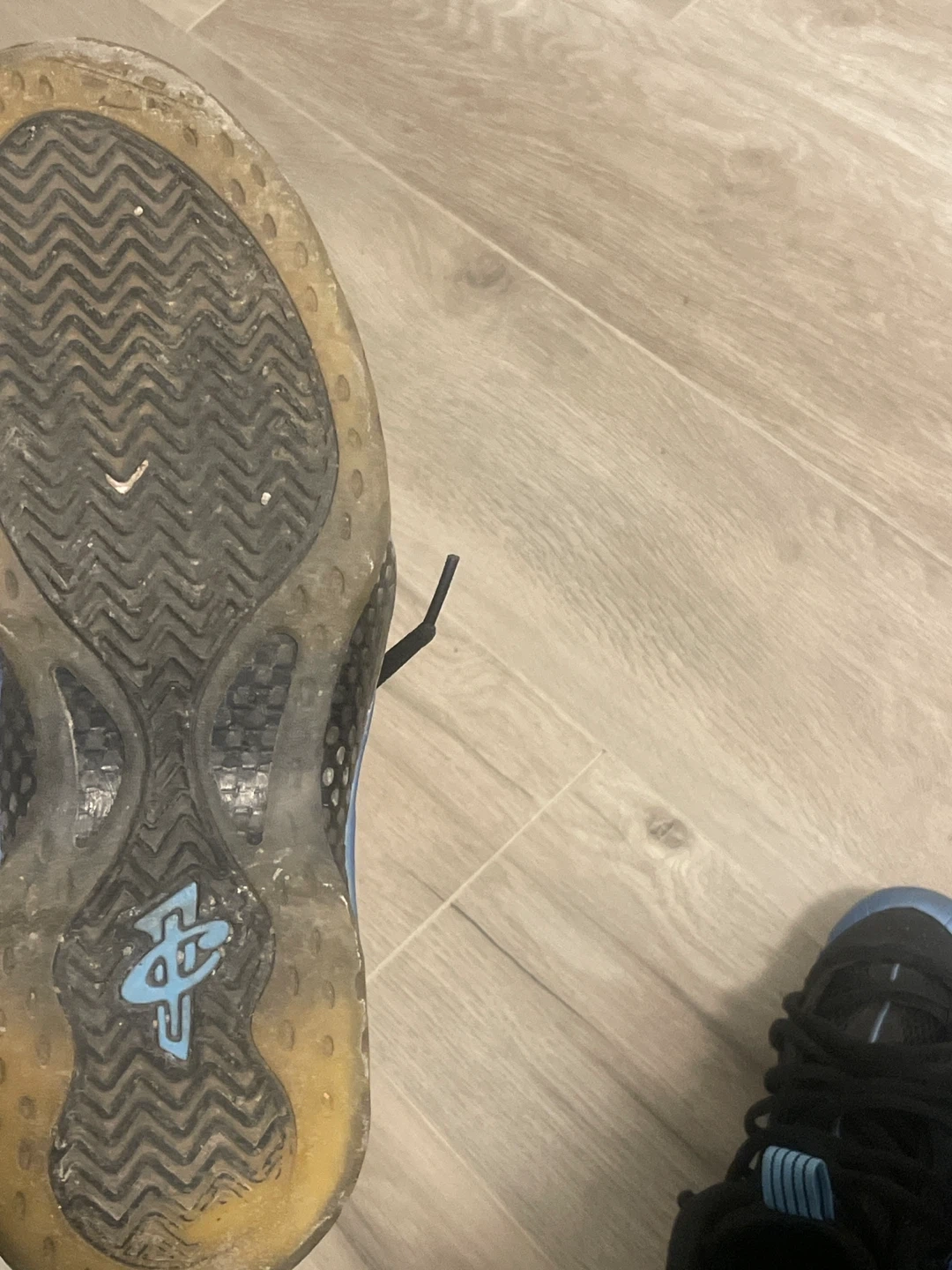 Selling a pair of Nike Air Foamposite One shoes in black and metallic gold. They show signs of wear, as seen in the photos, but still have lots of life left!
