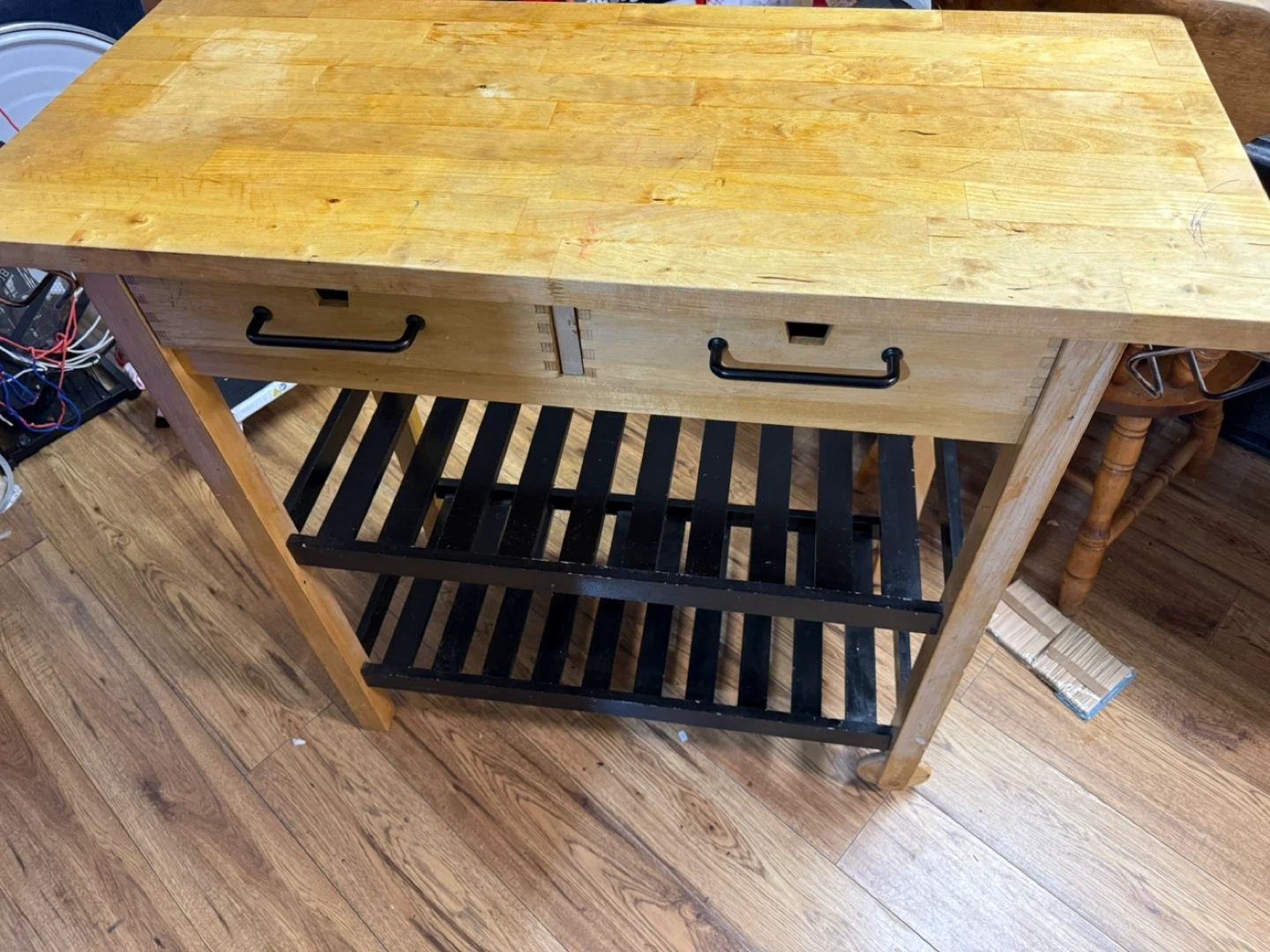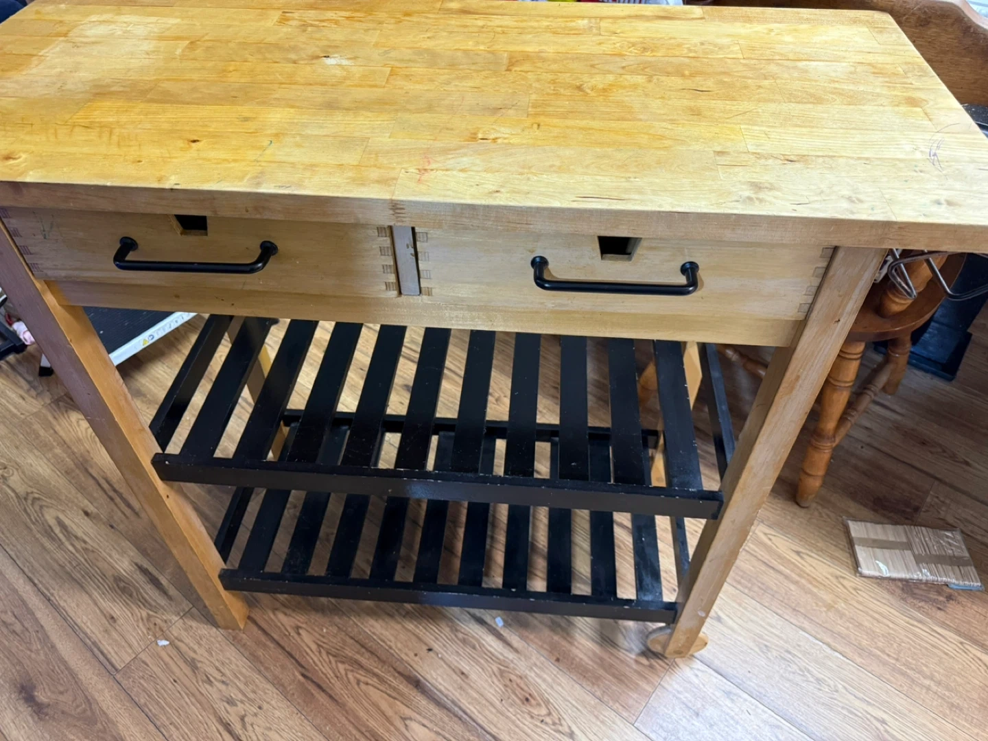 Selling a kitchen island with a wooden top and black storage shelves. It also has two drawers for extra storage! It's in good condition and ready for a new kitchen.