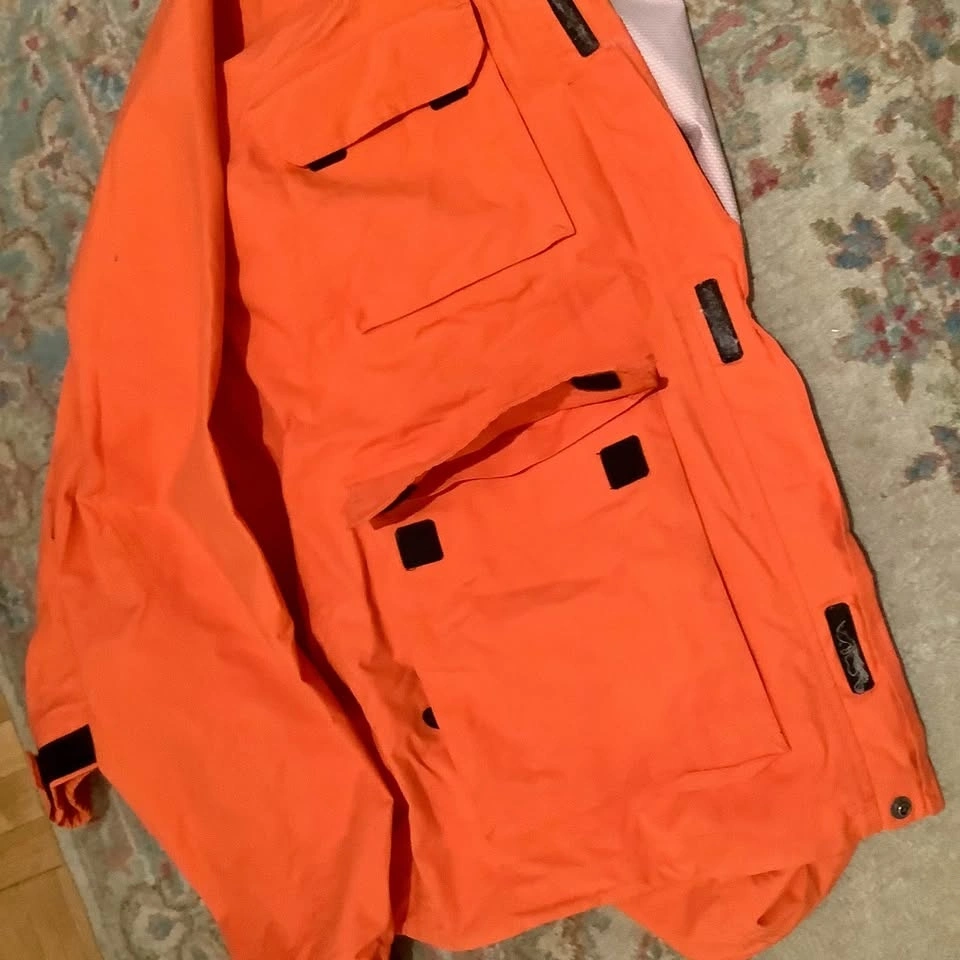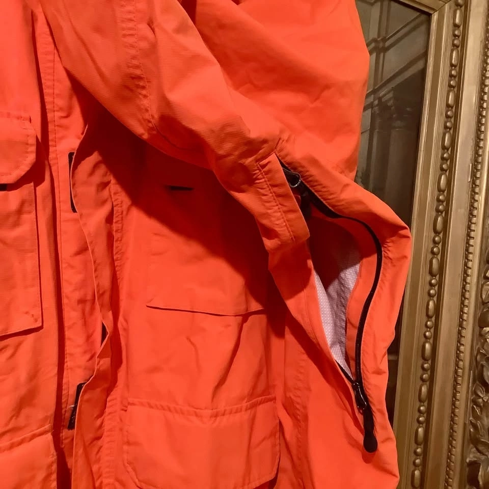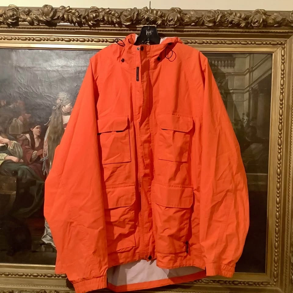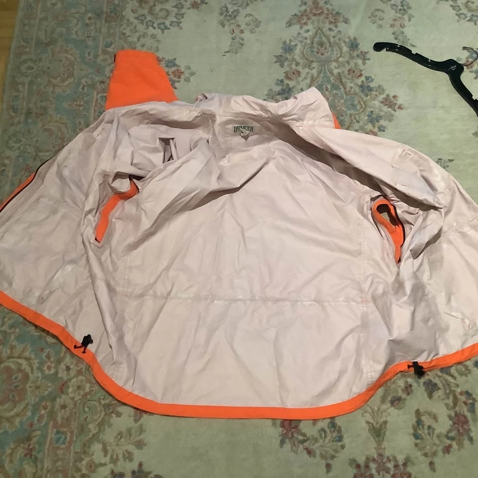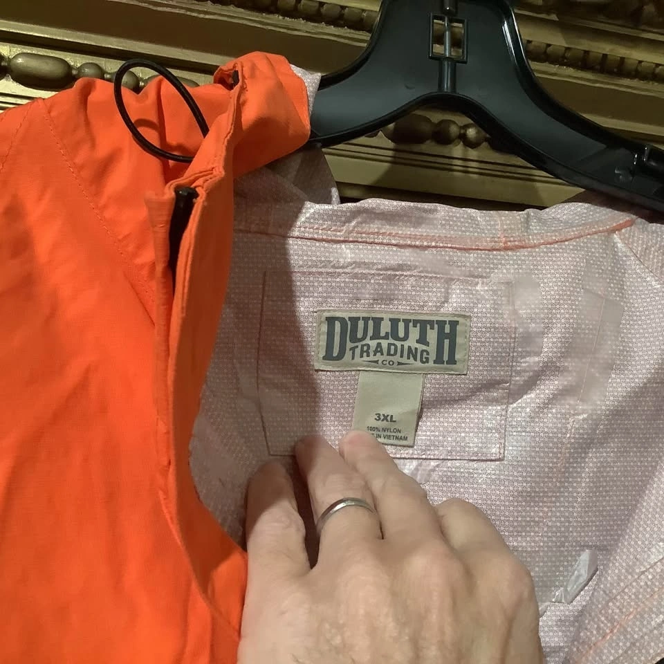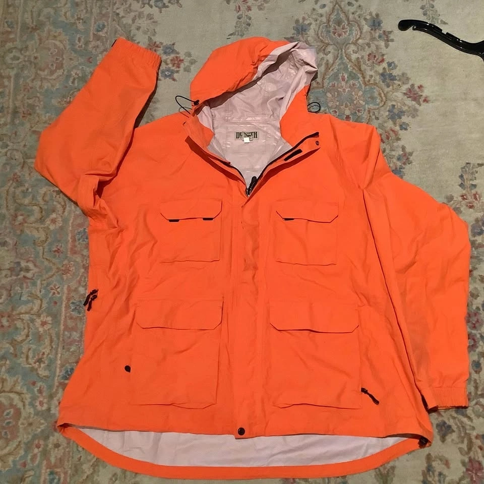 The Duluth Trading No-Rainer Waterproof Raincoat Jacket in Men’s 3XL is a practical and durable outerwear option for those who need a reliable waterproof jacket for various occasions. Made with nylon outer shell material and lining, this mid-length jacket features a solid orange color and a zip closure for easy use. With features like a drawstring hood, multiple pockets, and breathable design with zipper side vents.