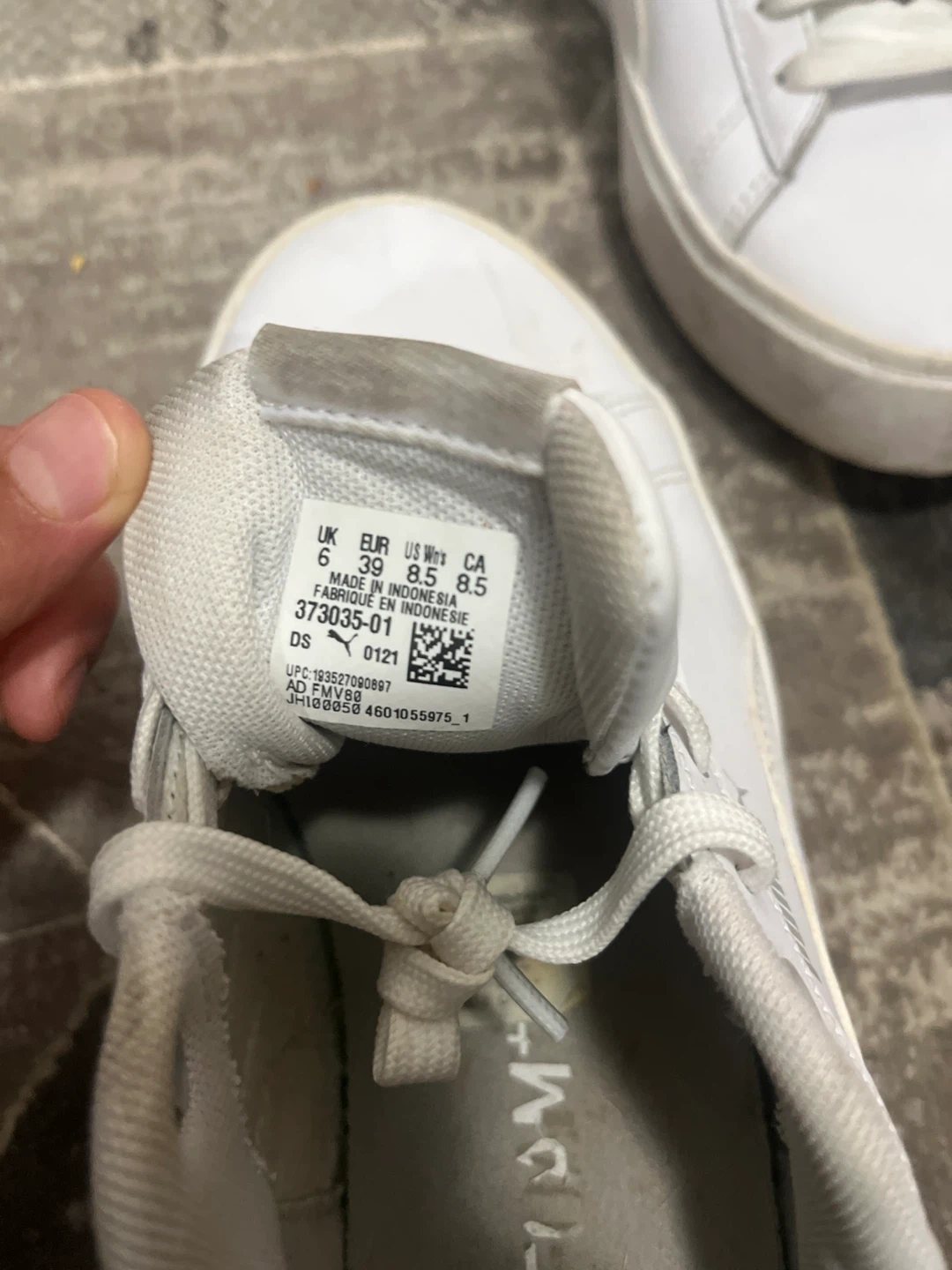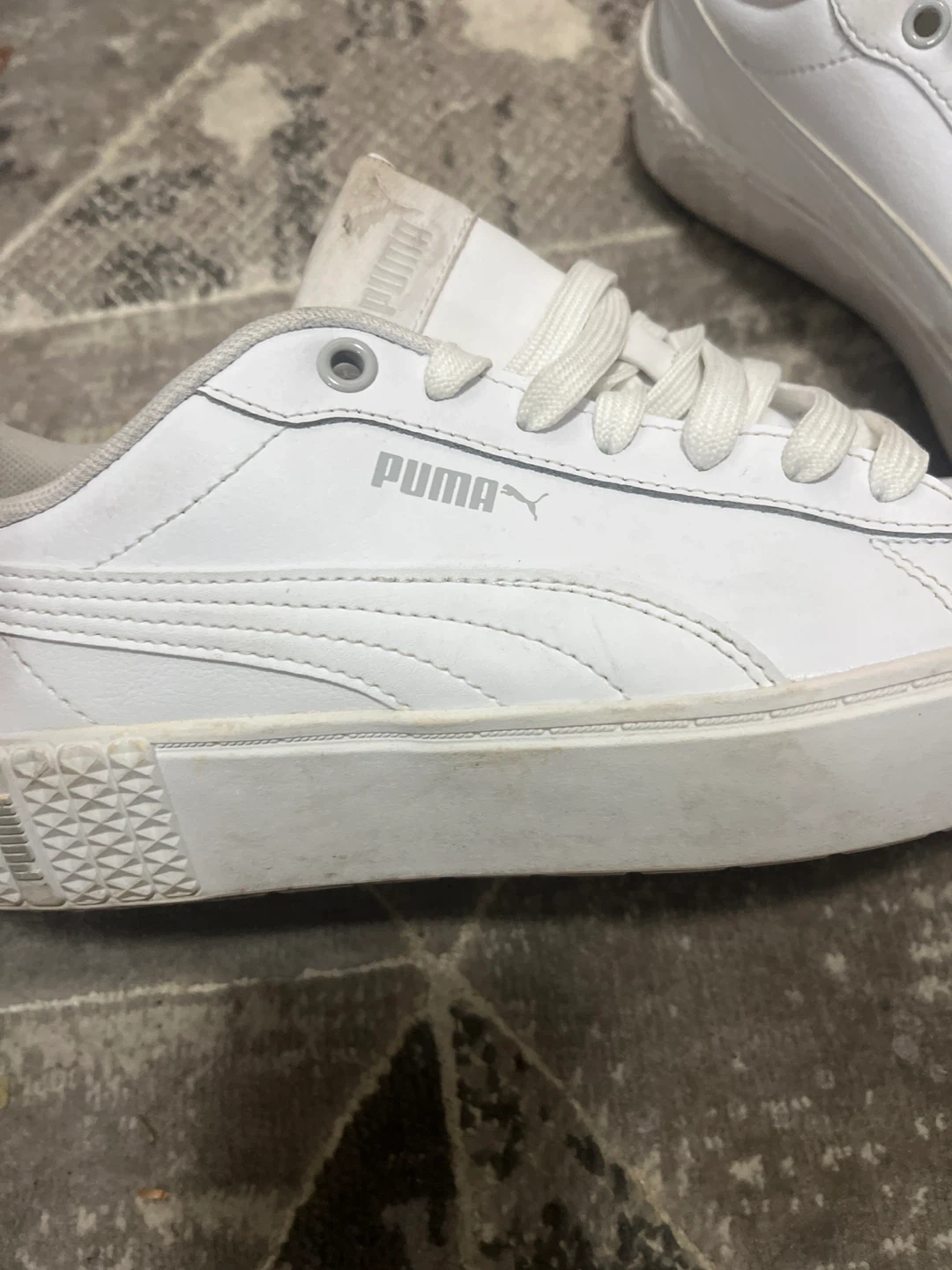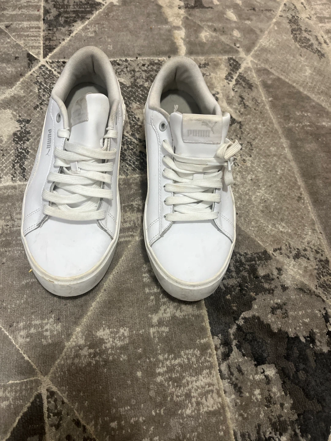 Selling a pair of Puma sneakers in women's size 8.5. They're a classic white leather style, perfect for everyday wear. Some signs of use, but still lots of life left!