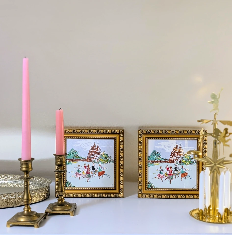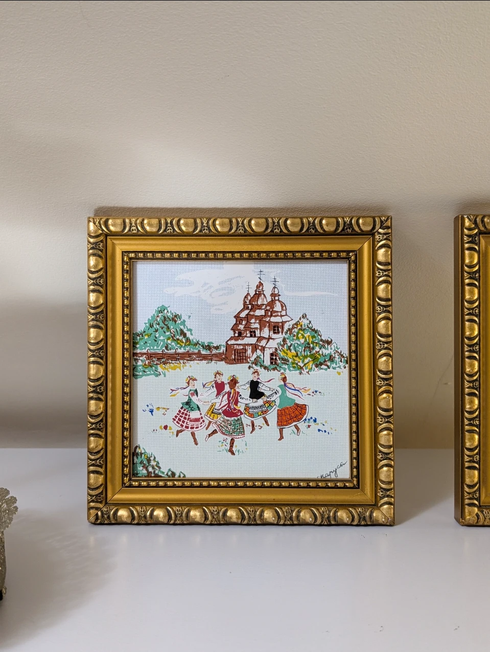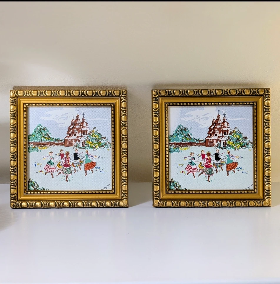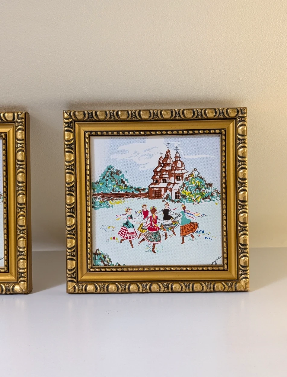 Set of two vintage framed serigraphs on tile art pieces. They feature a charming scene of Ukrainian women folk dancing wearing vinok in front of a building. Artist signature in bottom right corner.