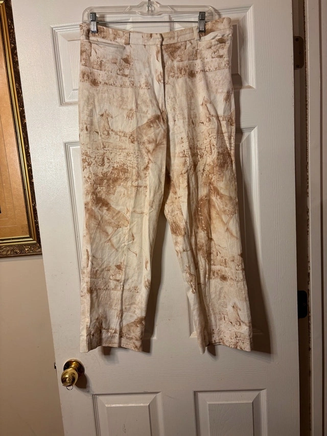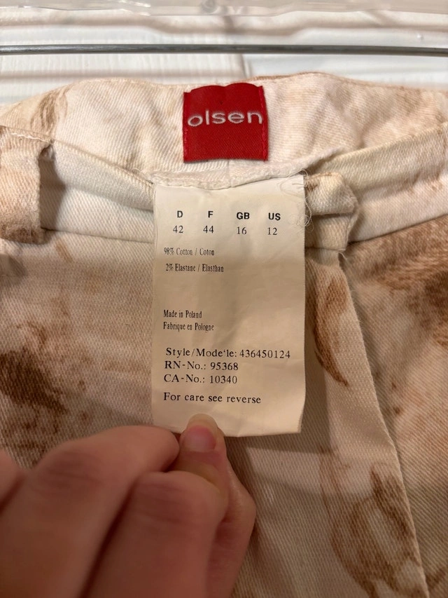 $20 or best offer - Well-made Olsen trousers crafted in Poland from 98% cotton with a touch of elastane for added comfort and flexibility. Features a straight-leg cut with a neutral abstract marbled pattern in soft beige and brown tones. Lightweight, breathable, and easy to style for everyday wear, work, or casual outings. Size US 12 (GB 16 / EU 44). Very good pre-owned condition.