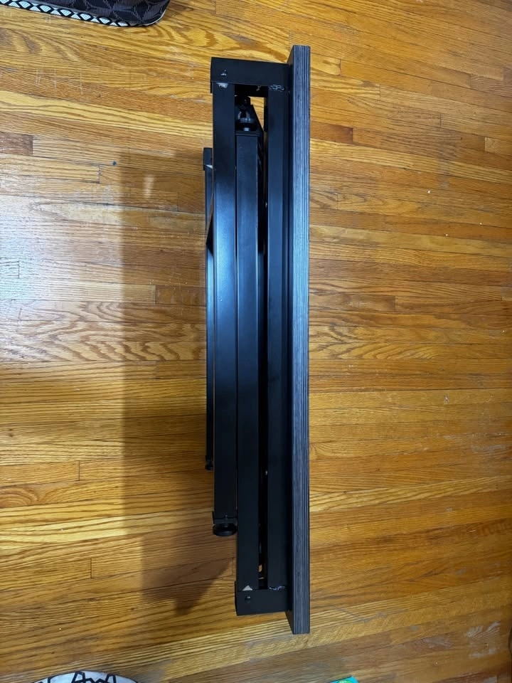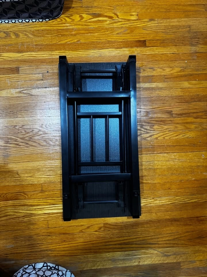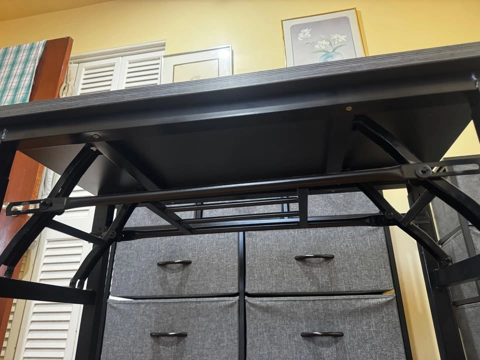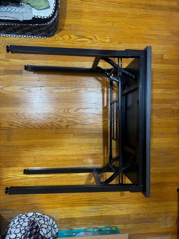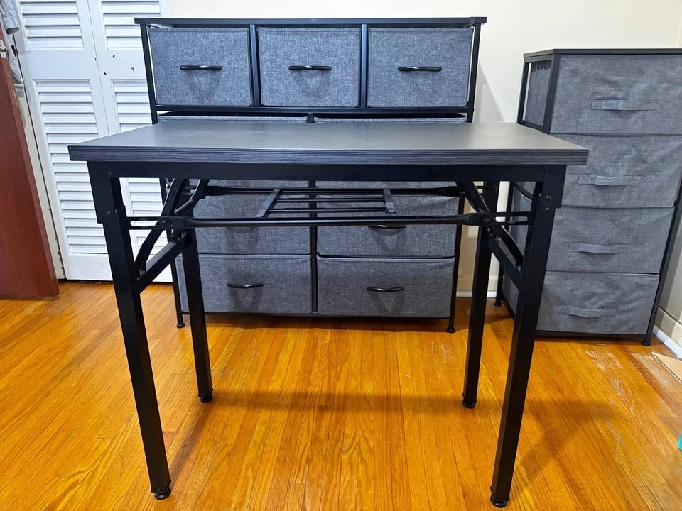 The folding computer desk has been assembled completely and folds up and down quickly. It's only 3-1/4 inches thick when folded, which is convenient for storage.