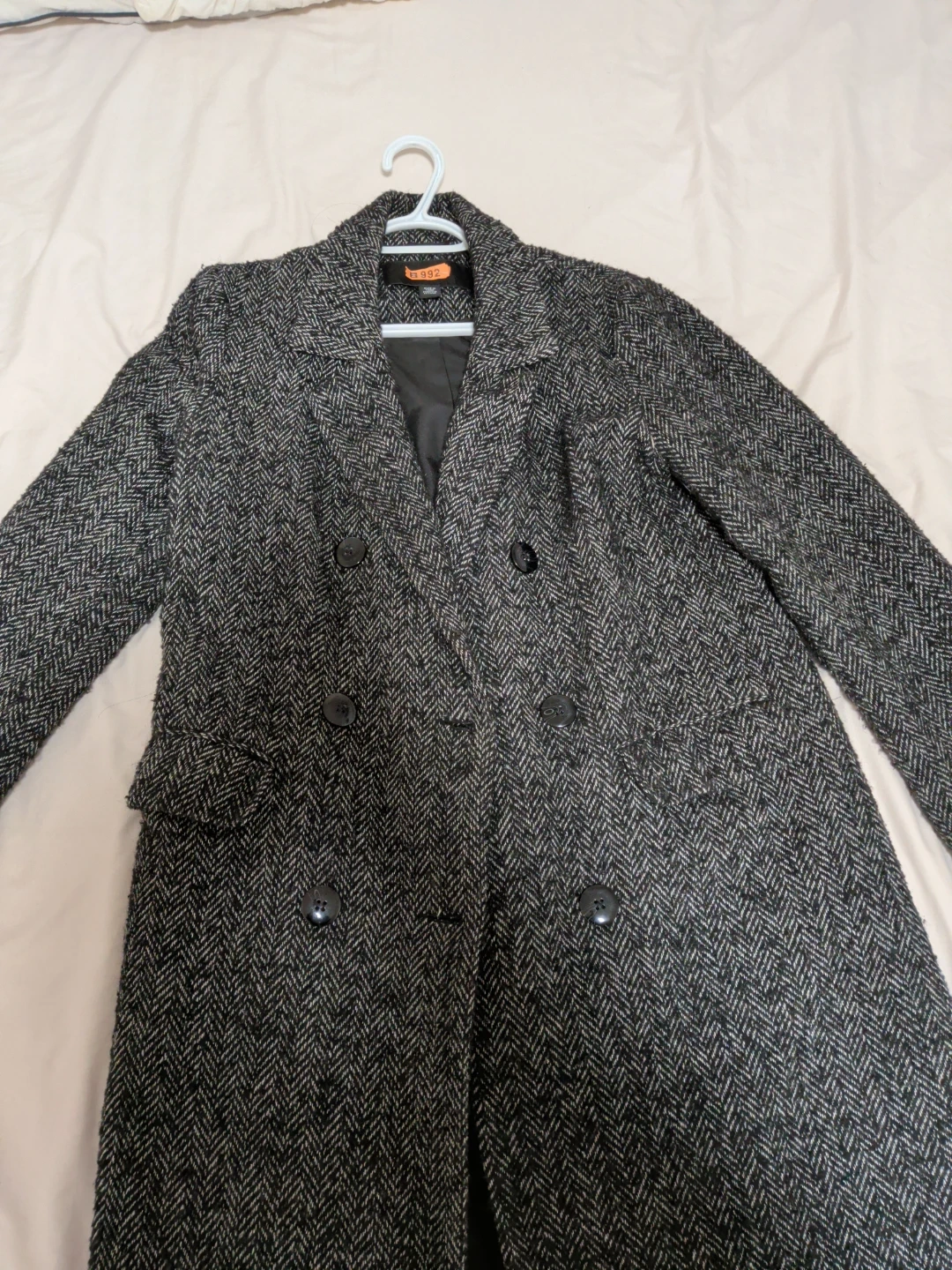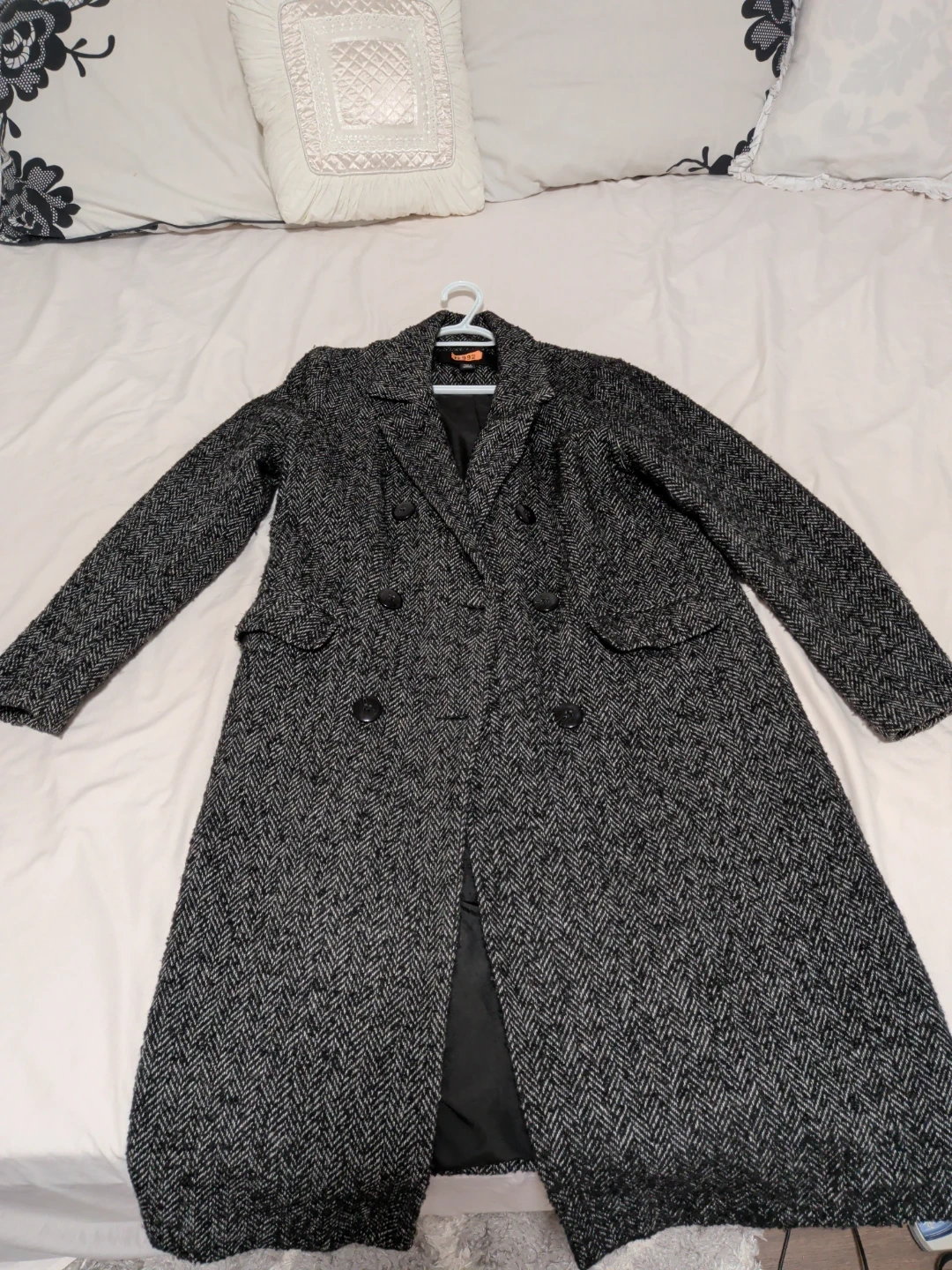 Selling a Le Chateau herringbone pattern coat. It's a wool blend and features a double-breasted design. Great for keeping warm during the colder months!