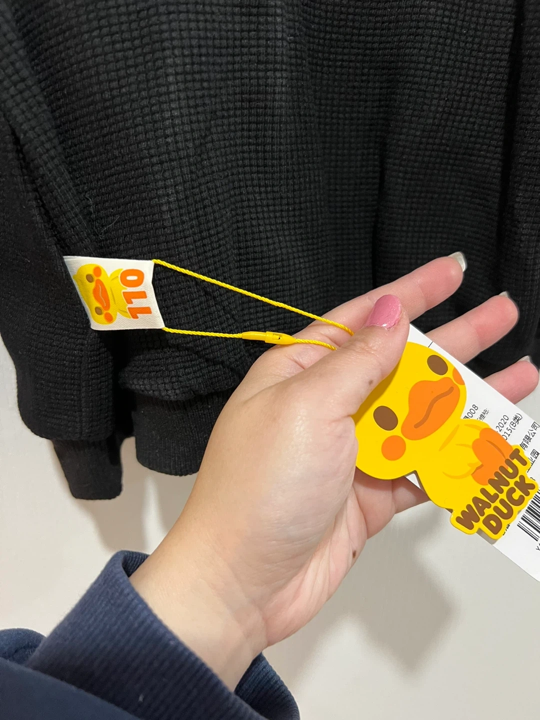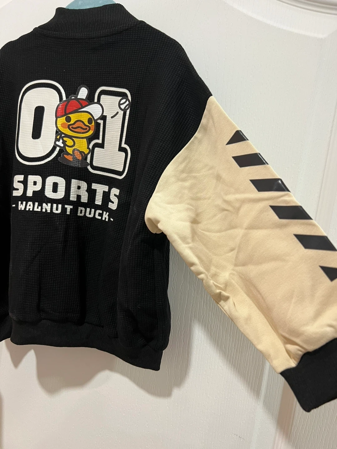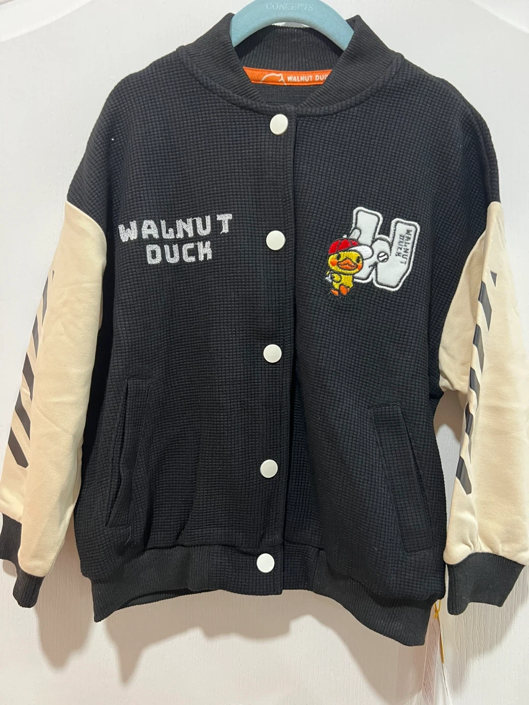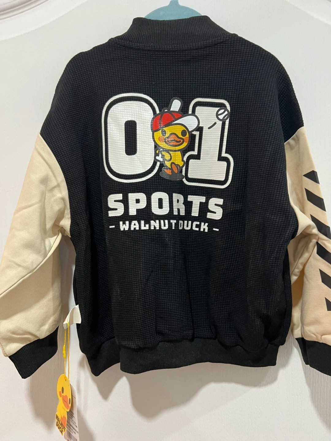 Selling a super cute Walnut Duck jacket for kids! It's a size 110 and features a fun design with the Walnut Duck character. The jacket is black with beige sleeves and has a sporty look