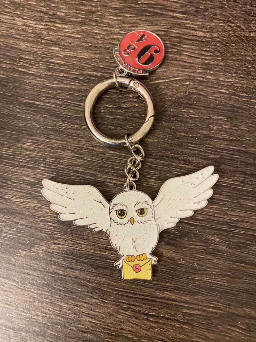 Selling a cute Harry Potter keychain featuring Hedwig the owl! It also has a Platform 9 3/4 charm attached