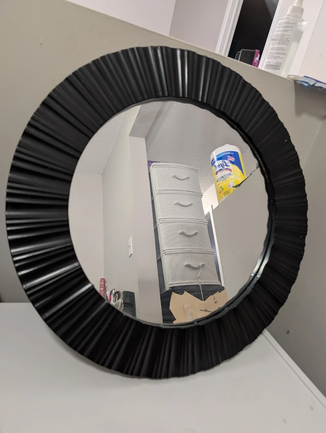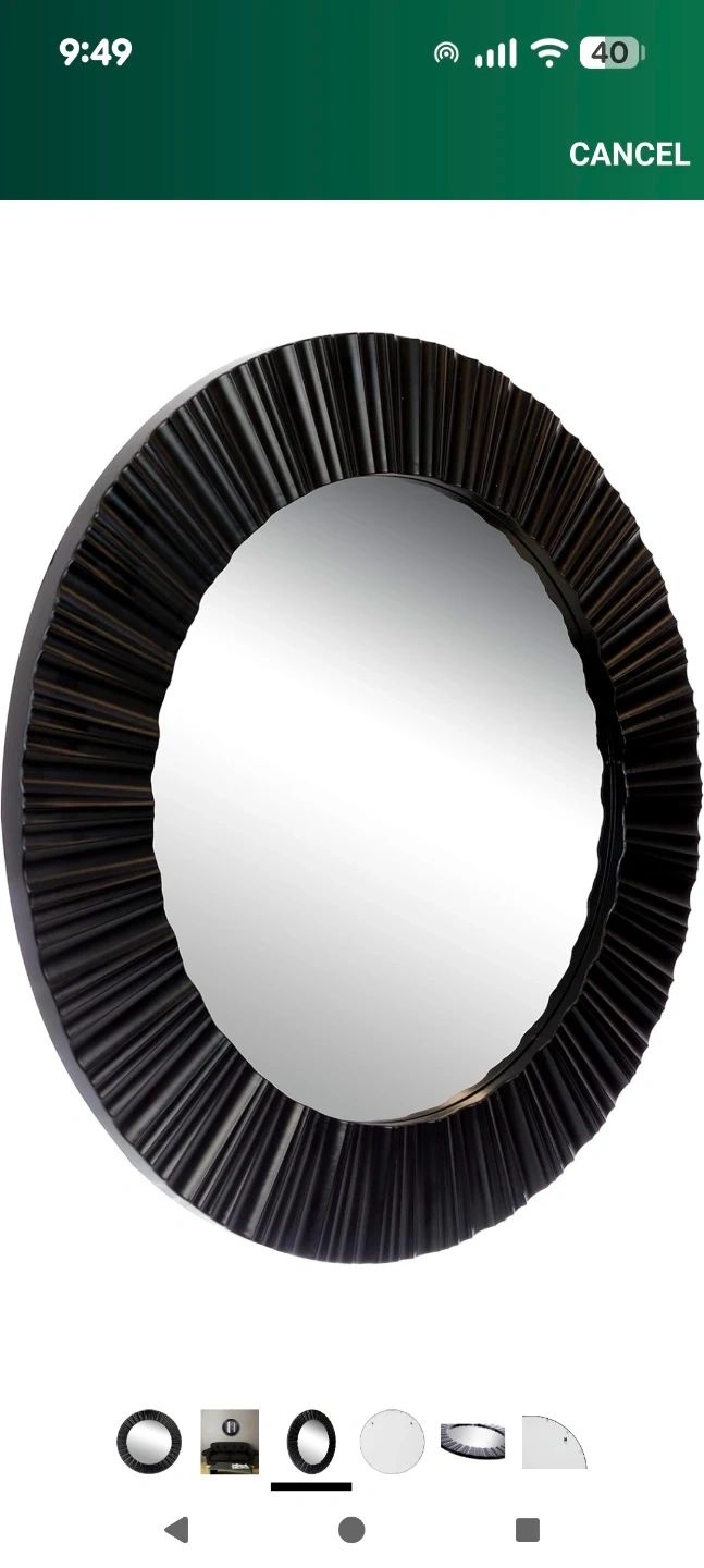 Here's a stylish round wall mirror with a unique black frame! It would be a great addition to any room. The mirror is in excellent condition and ready to be hung up