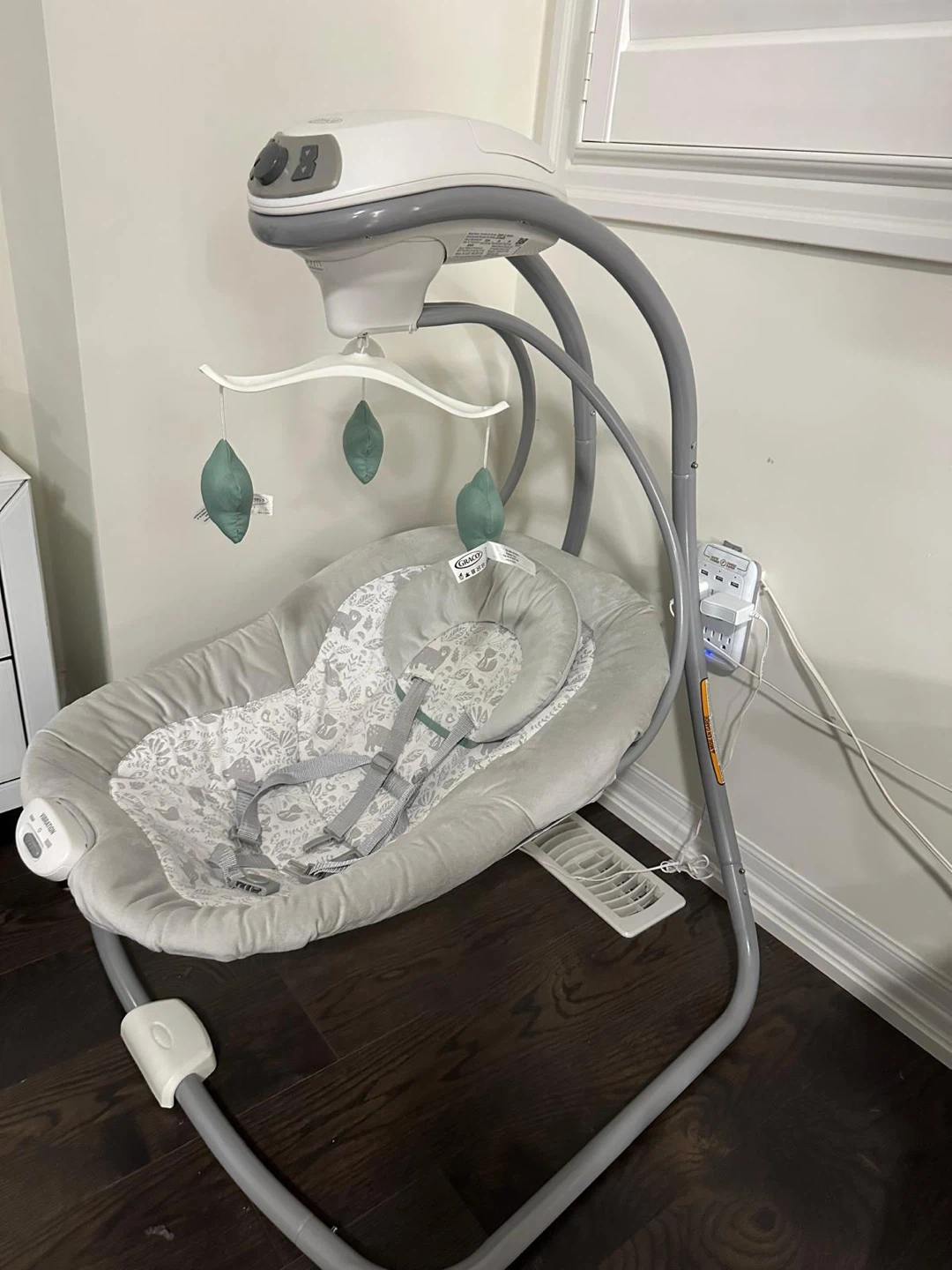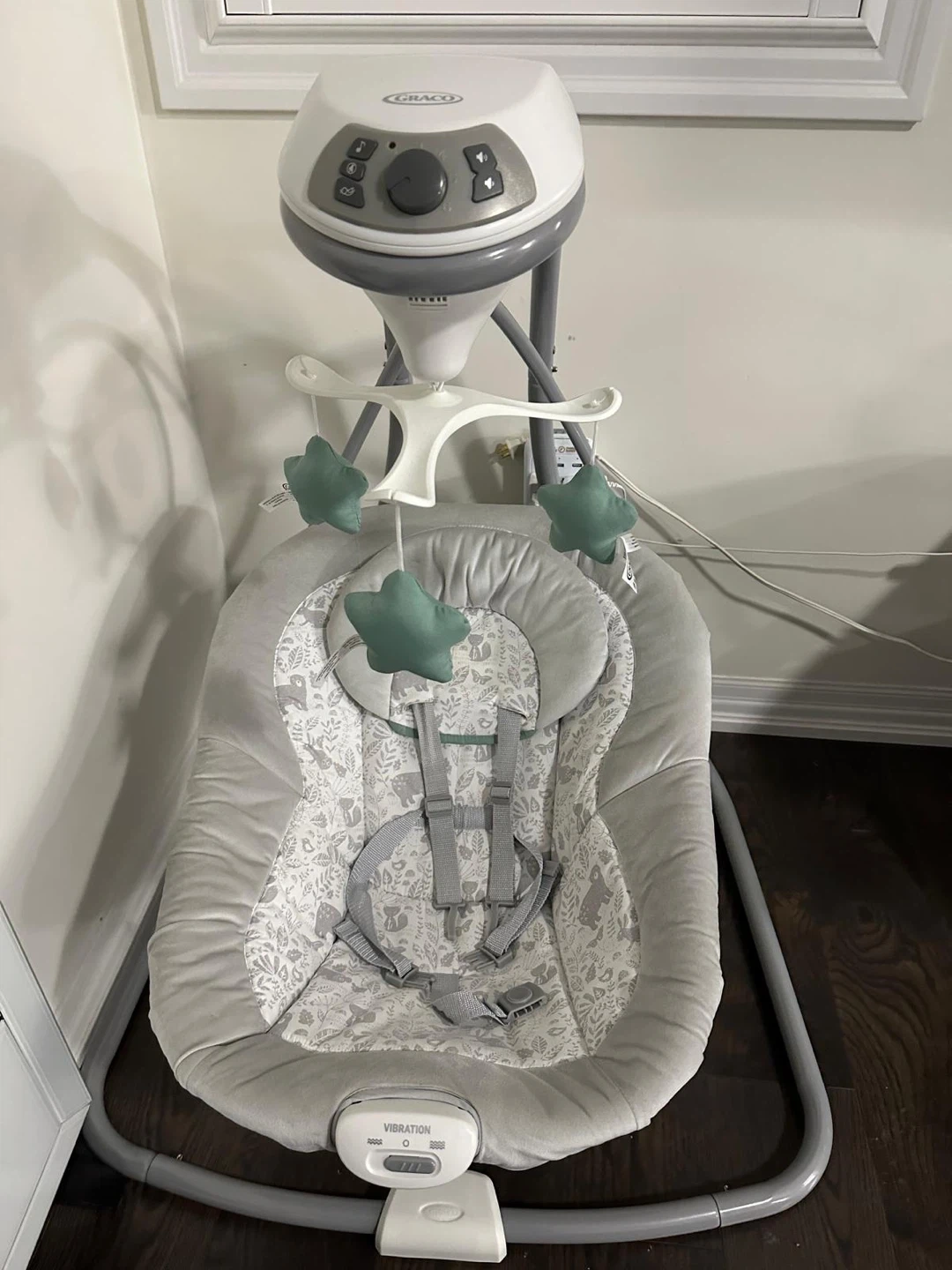 Selling a gently used Graco baby swing in great condition! It features a comfortable seat with a cute pattern and includes hanging toys to keep your little one entertained. Perfect for soothing and relaxing your baby