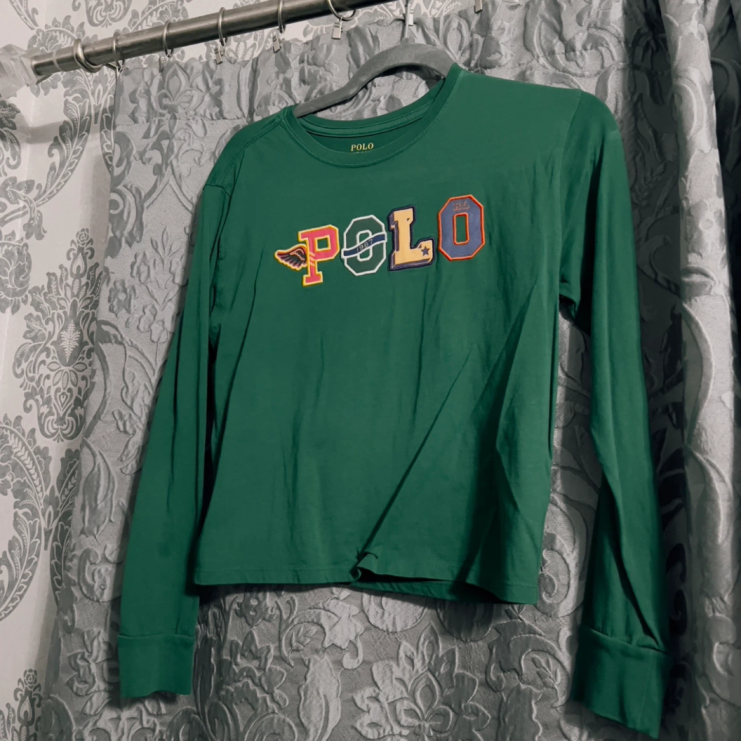 Here's a Polo Ralph Lauren long sleeve shirt! It's a vibrant green color with the classic Polo logo across the chest. Perfect for casual wear!