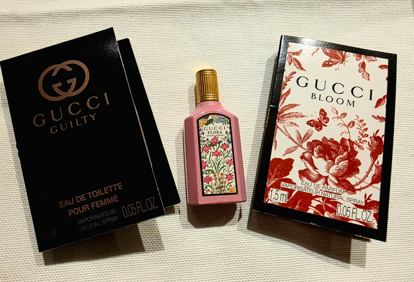 I'm selling a set of Brand New, Unopened Gucci perfumes: Gucci Flora Gorgeous Gardenia Eau de Parfum 7.5ml, Gucci Guilty Eau de Toilette (1.5ml), and Gucci Bloom Eau de Parfum (1.5ml). Perfect for trying out these iconic scents!