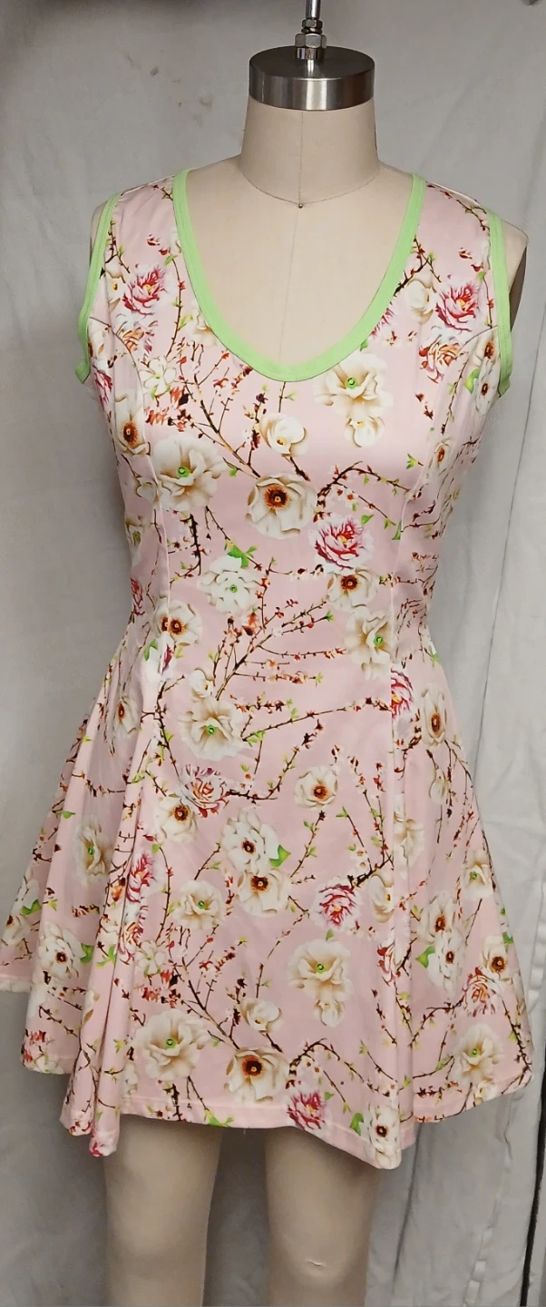 This is a cute dress with a light pink background and a floral print. It has a green trim around the neckline and armholes. It's in great condition and ready for a new owner!