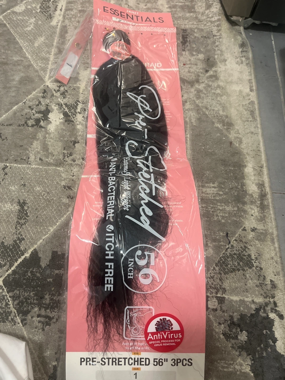 Selling a brand new pack of Janet Collection Essentials pre-stretched braiding hair. It's 56 inches long and comes with 3 bundles. The hair is anti-bacterial and itch-free!