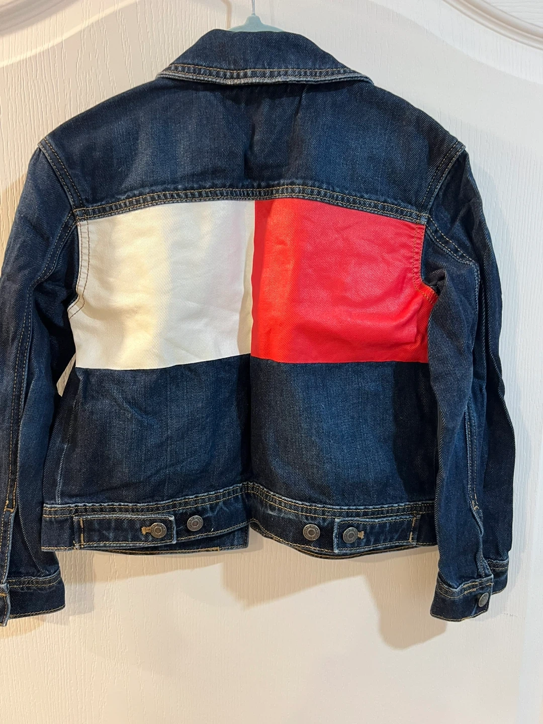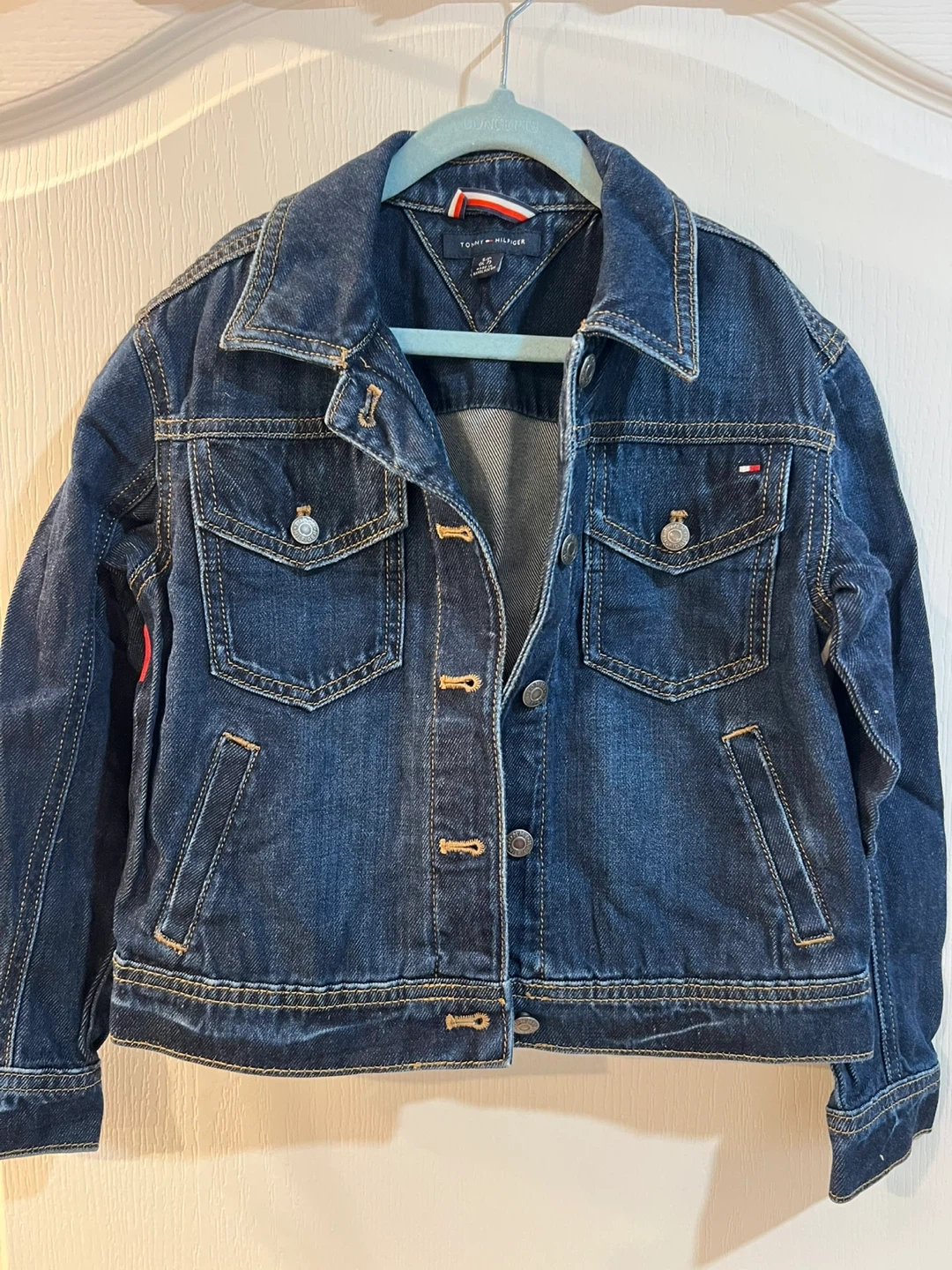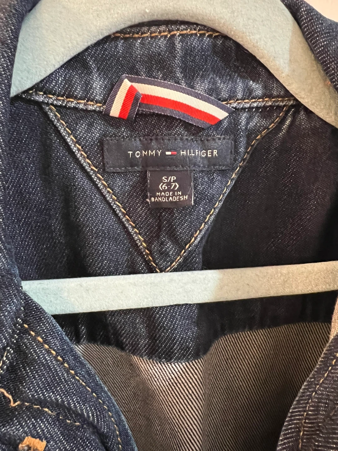 Selling a Tommy Hilfiger denim jacket in size S (6-7). It's in great condition and features the classic Tommy Hilfiger design on the back. Perfect for layering or wearing on its own!