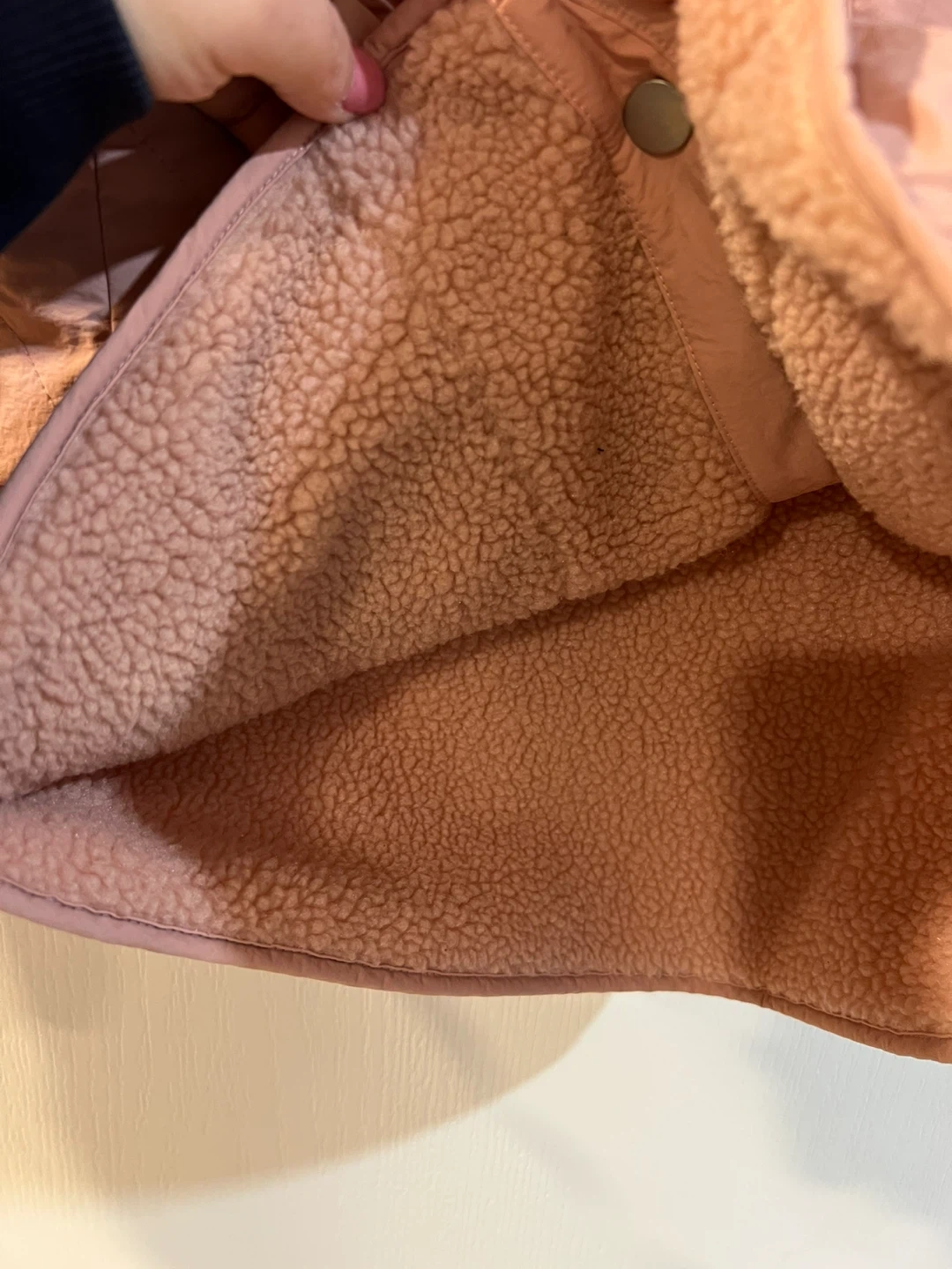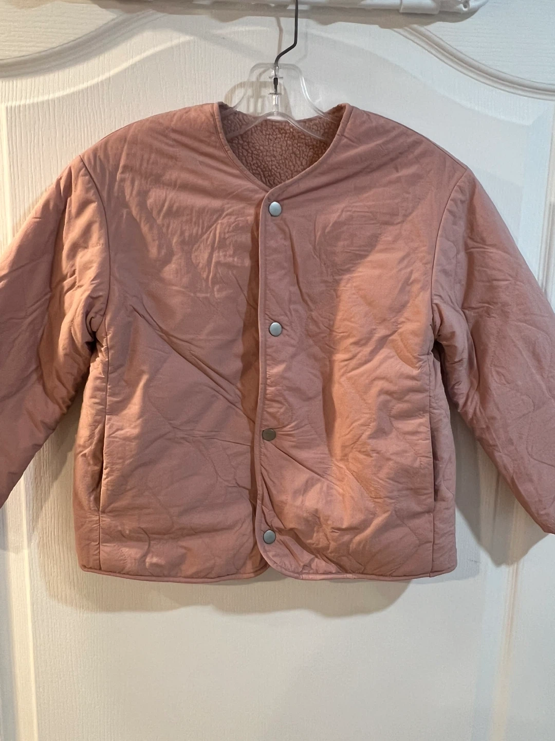 A cute pink quilted jacket with a reversible sherpa lining! It's perfect for layering on chilly days. The jacket features a button-up front and convenient pockets.