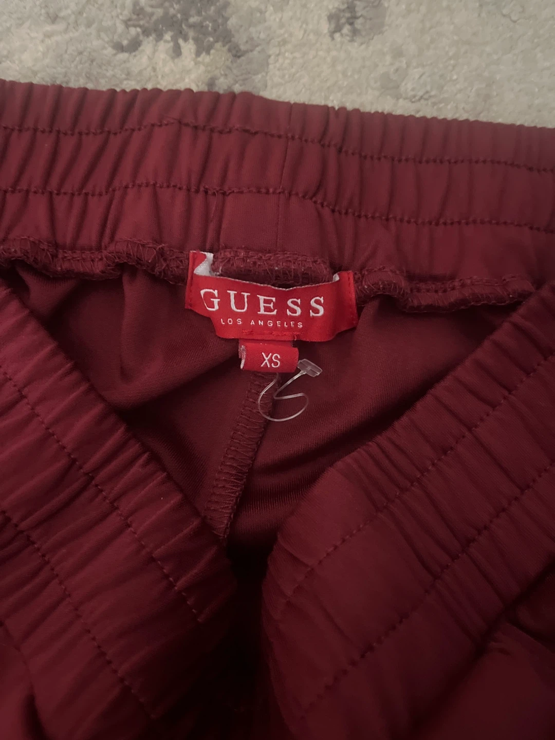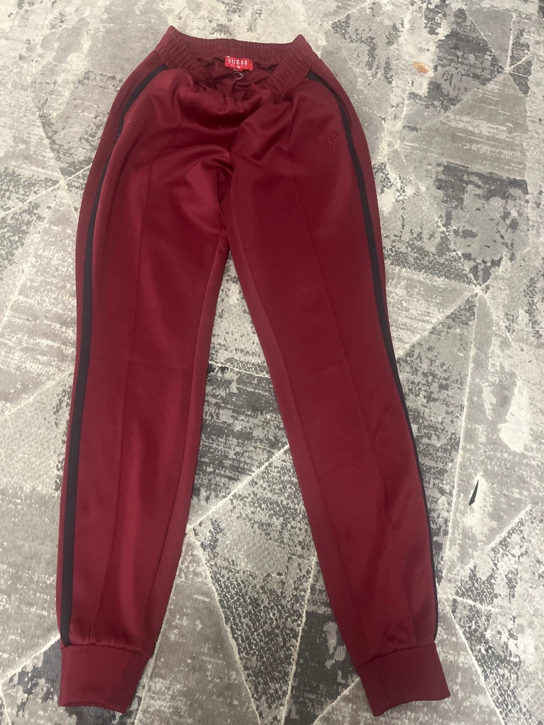 Selling a pair of Guess Los Angeles track pants in size XS. They're a stylish burgundy colour with black stripes down the sides. Perfect for lounging or a casual outing!